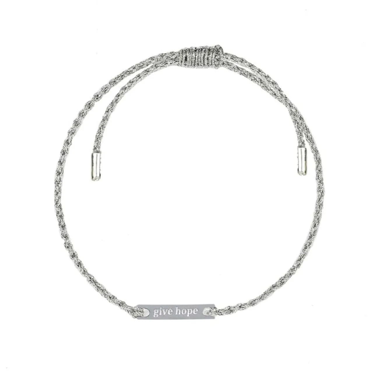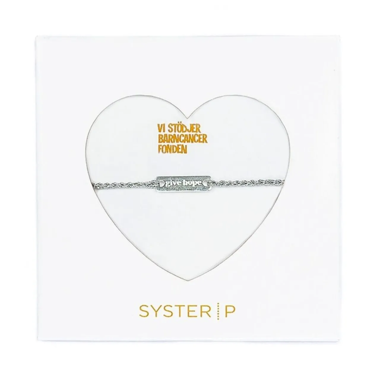 Trådarmband i färgen silver metallic från Syster P med platta tillverkad av återvunnet sterlingsilver med inskriptionen ”Give Hope”. För varje sålt armband doneras 100kr oavkortat till organisationen Barncancerfonden för att stödja deras viktiga kamp mot barncancer. Armbandet finns tillgängligt i flera färger.