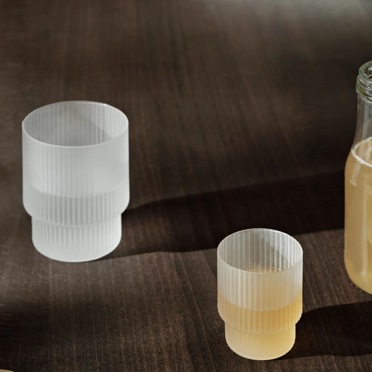 Glasen ingår i kollektion Ripple från Ferm Living som består av två storlekar på dricksglas, champagneglas, vinglas och karaff.