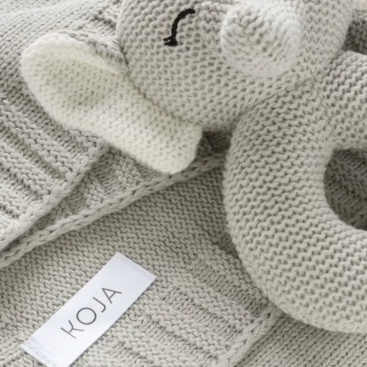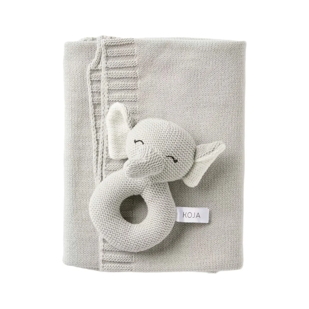 Sött presentkit till de allra minsta, perfekt som doppresent eller som gåva till den nyfödda. MAJA gåvokit består av en skallra i milda färger, samt en färgmatchad filt. Skallran har en mjuk stickad yta i 100% bomullsgarn och broderade detaljer i ansiktet. Den finstickade filten har en ribbad kant runt om och blir skön att ha i sängen eller vagnen. Välj mellan följande djur: kanin, räv eller elefant. Perfekt present till babyshowern, dop eller namngivning.