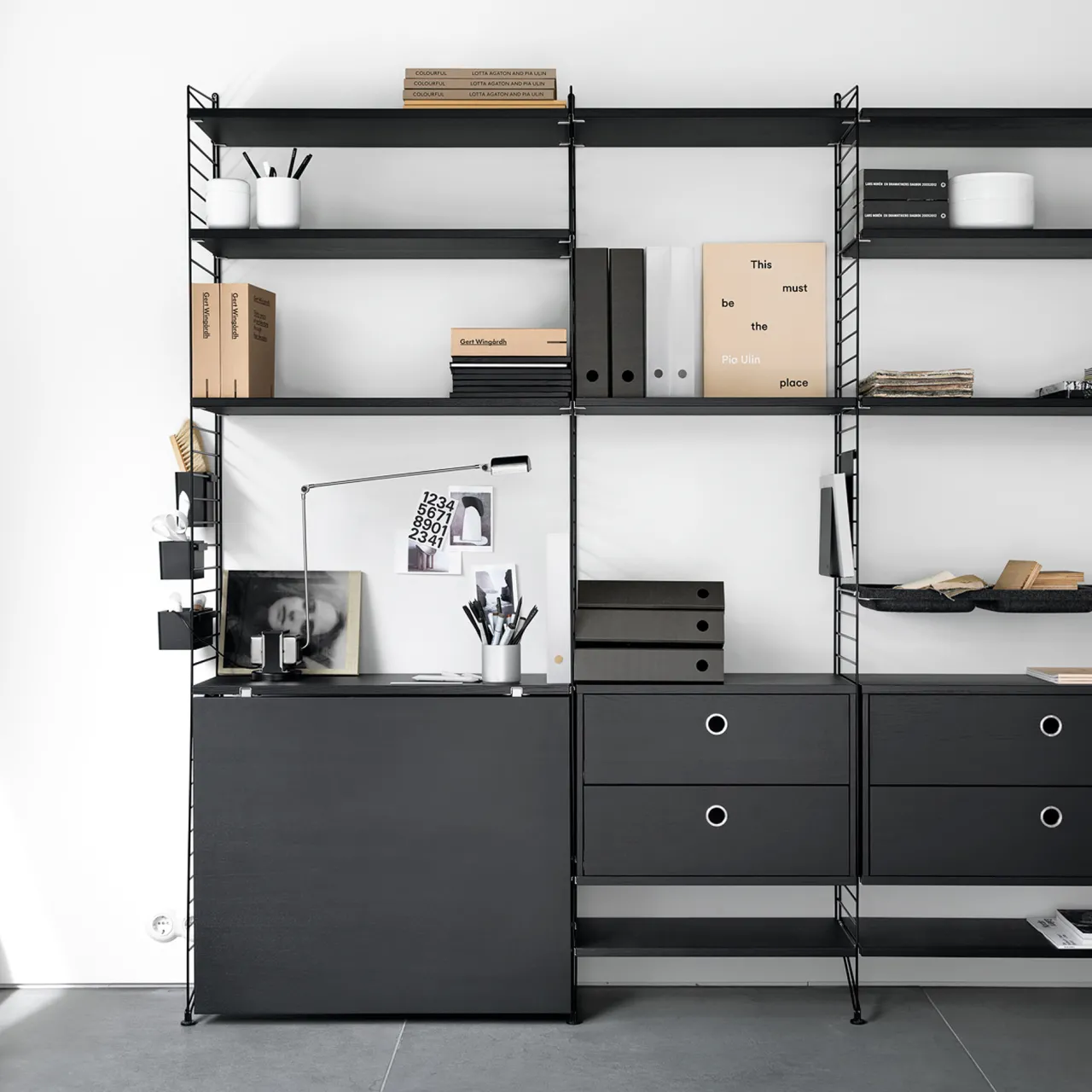 Väggavlarna finns i två höjder, 50 cm och 75 cm, samt två djup, 20 cm och 30 cm. Gavlarna är basen för att bygga din stringhylla. Därefter kan du addera produkter från String System. Välj mellan en rad olika produkter så som hyllplan och skåp. Väggaveln skruvas fast på väggen och rör varken golv eller tak vilket gör den flexibel och lätt att anpassa efter utrymmet. För att göra din hylla ännu mer funktionell och unik kan du även komplettera med organizers och s-krokar som hängs på gaveln. Väggavlarna säljs i både 1-pack och 2-pack.