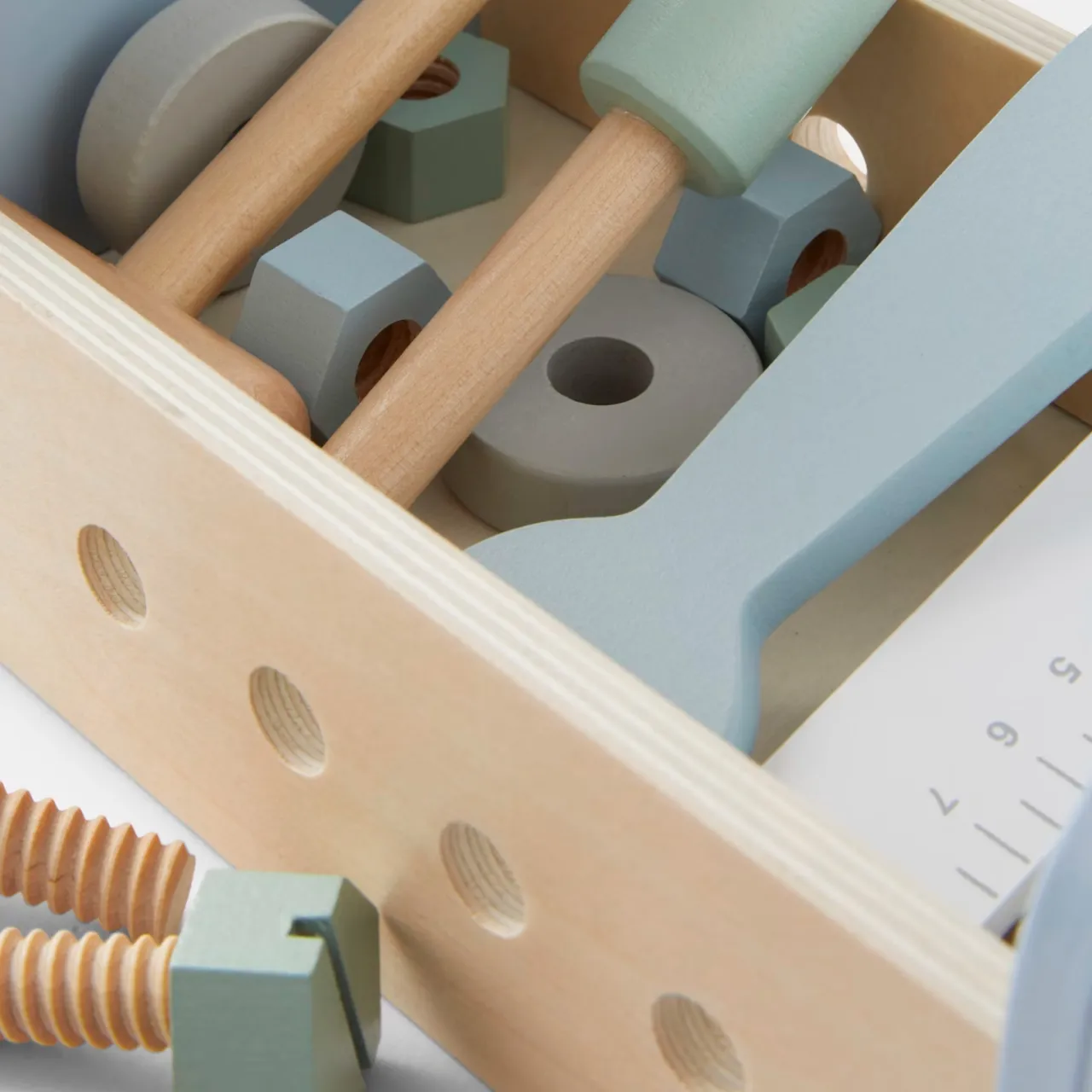 Verktygslåda i trä för den lilla snickaren. Med BOSSE verktygslåda kan barnet låta kreativiteten flöda samtidigt som finmotoriken tränas. I setet ingår en verktygslåda, en hammare, en skruvmejsel, en skiftnyckel, en linjal, en bultbräda med fyra löstagbara ben, sju skruvar, tre muttrar, två bultar, två brickor, två hålbrädor. 26 delar.
