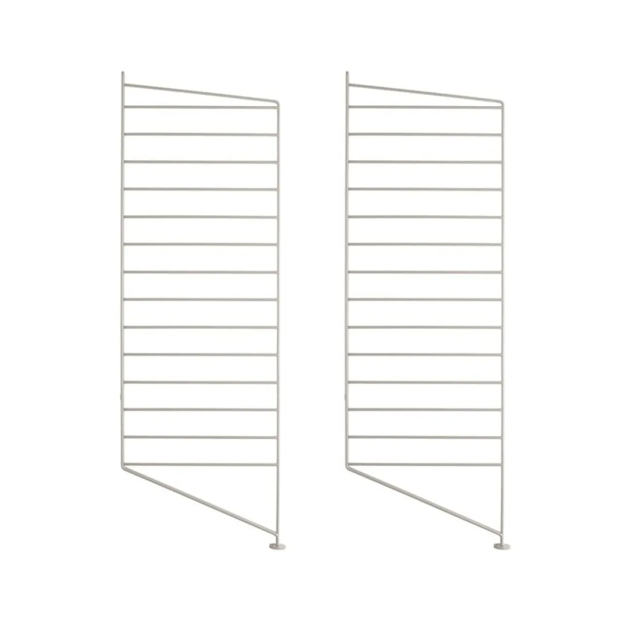Golvgavlar finns i tre höjder, 85 cm, 115 cm, 200 cm, samt ett djup, 30 cm. Gavlarna är basen för att bygga din stringhylla. Därefter kan du addera produkter från String System förutsatt att de har 30 cm djup. Välj mellan en rad olika produkter så som hyllplan, skåp, lådhurtsar och tidskriftshyllor. Golvgaveln vilar mot golvet med sin fot vilket gör den väldigt stabil men samtidigt ger en lätt och luftig känsla. För att göra din hylla ännu mer funktionell och unik kan du komplettera med organizers, knivblock eller en tidskriftssamlare som hängs på gaveln. Golvgavlarna säljs i både 1-pack och 2-pack.