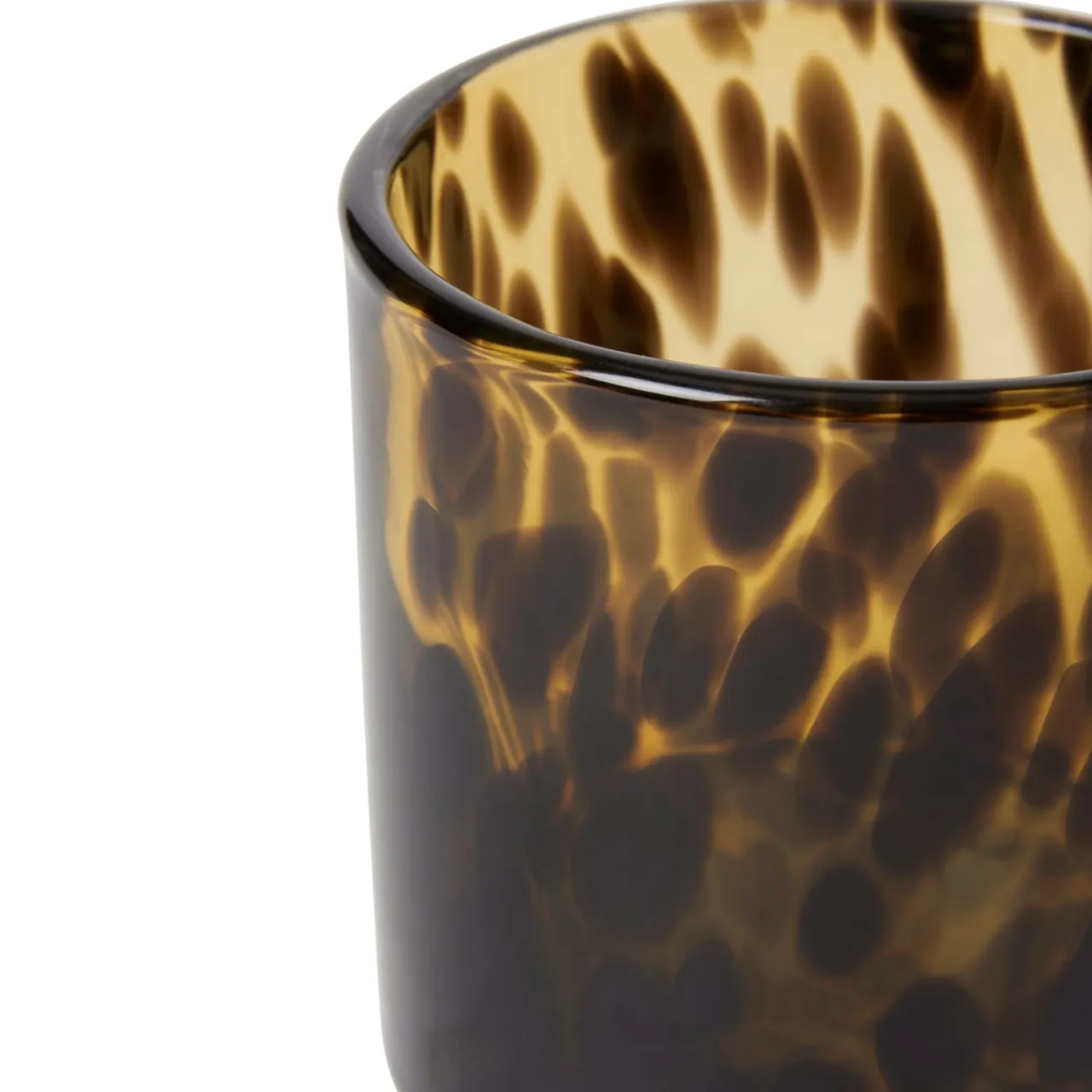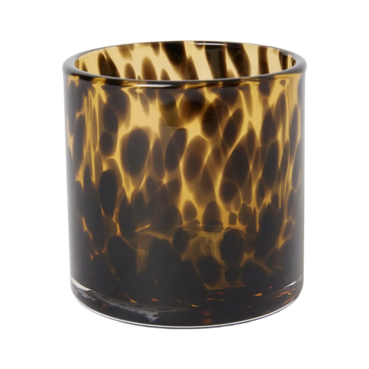 Leopardmönstrad ljuslykta för värmeljus, tillverkad av sodaglas.