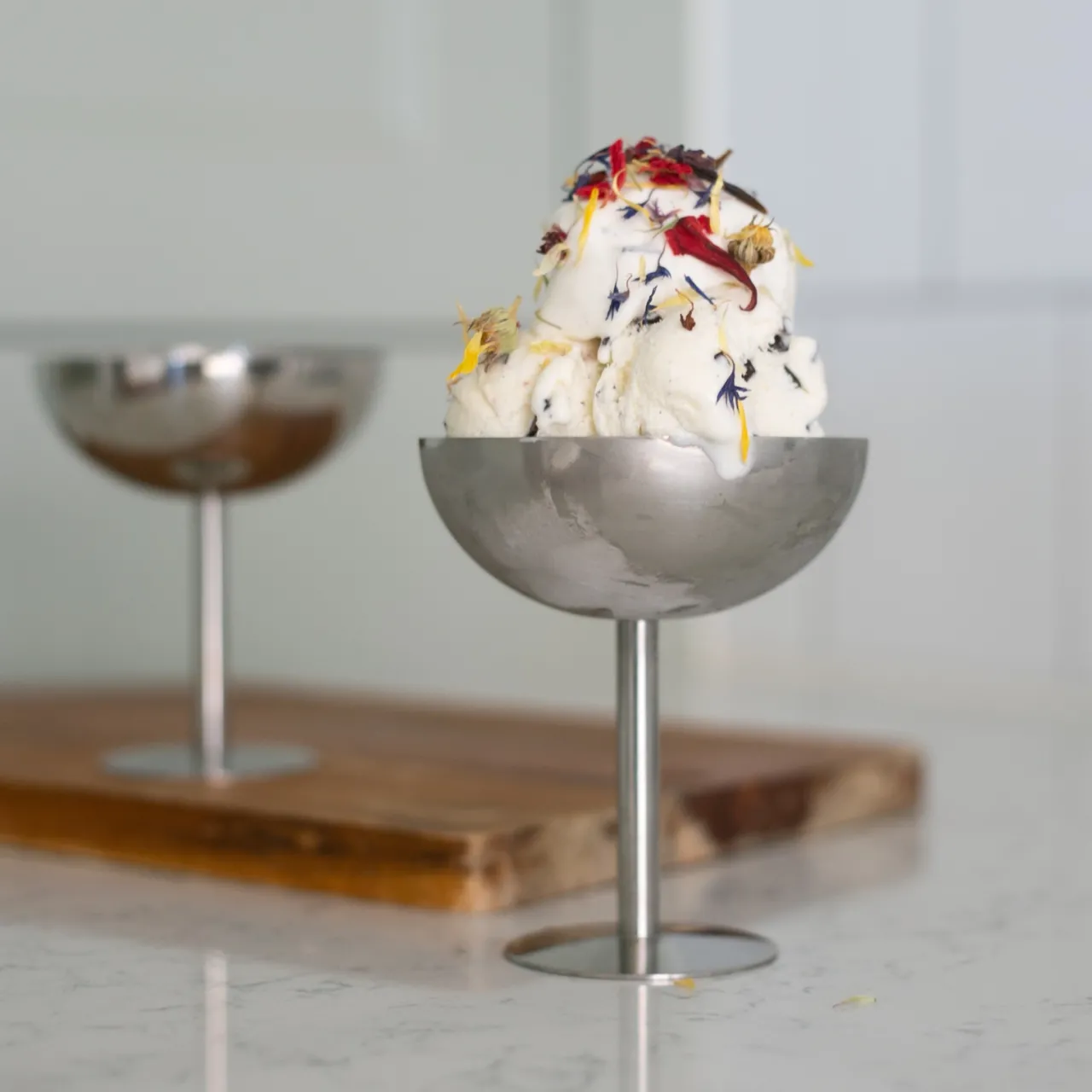 Glasskål på fot, tillverkad av mattborstat rostfritt stål.