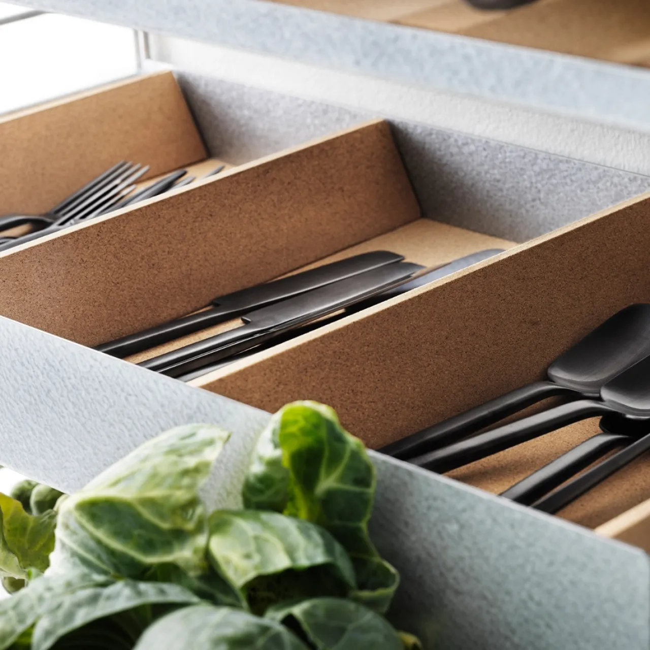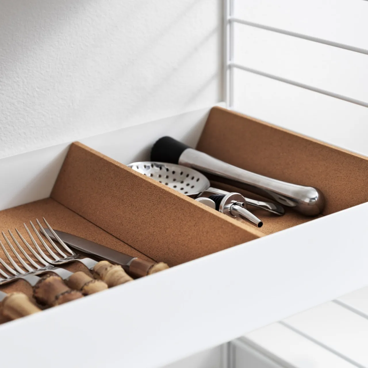 Korkavdelare är en smart tilläggsaccessoar som passar perfekt i köket. Använd dem på Strings underlägg för att enkelt skapa sektioner på metallhyllplanen. Varje avdelare mäter 5,5 cm i bredd, 30 cm i djup och 5 cm i höjd, och varje förpackning innehåller fyra avdelare.