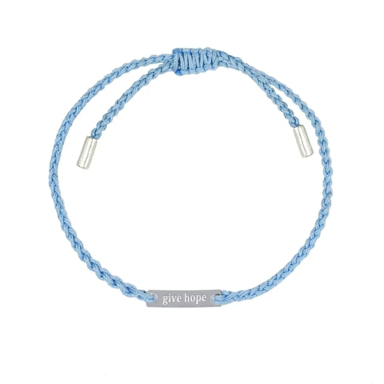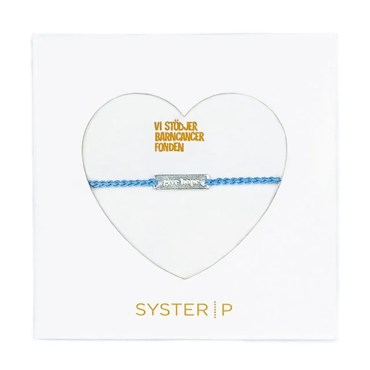 Trådarmband i färgen powder blue från Syster P med platta tillverkad av återvunnet sterlingsilver med inskriptionen ”Give Hope”. För varje sålt armband doneras 100kr oavkortat till organisationen Barncancerfonden för att stödja deras viktiga kamp mot barncancer. Armbandet finns tillgängligt i flera färger.
