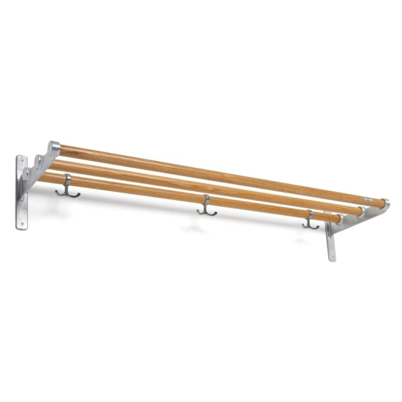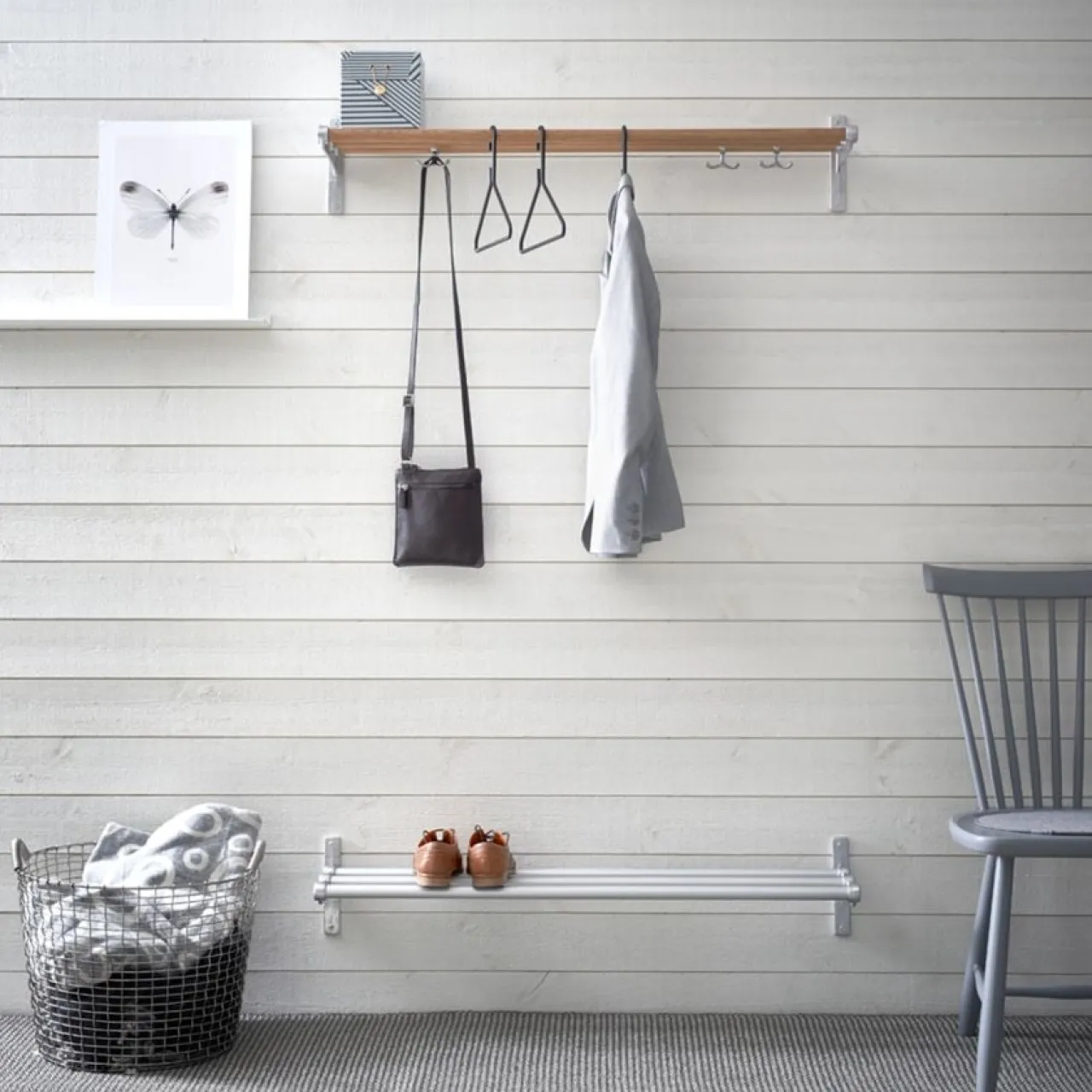 Retrosnygga hatt- och skohyllan Nostalgi ritades 1937 av Gunnar Bolin för Essem. Hyllan har kommit och gått genom decennierna, men ses idag som en klassiker i svensk möbelhistoria. Konsolerna tillverkas, nu som då, av nersmält aluminiumskrot som förenas av rundstav i trä. 3-pack ankarkrokar medföljer. Skruvar för upphängning ingår ej.