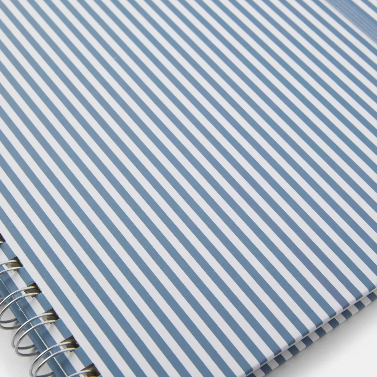 Linjerad skrivbok med färgmatchad elastisk snodd, spiralrygg och randiga pärmar i kartong.