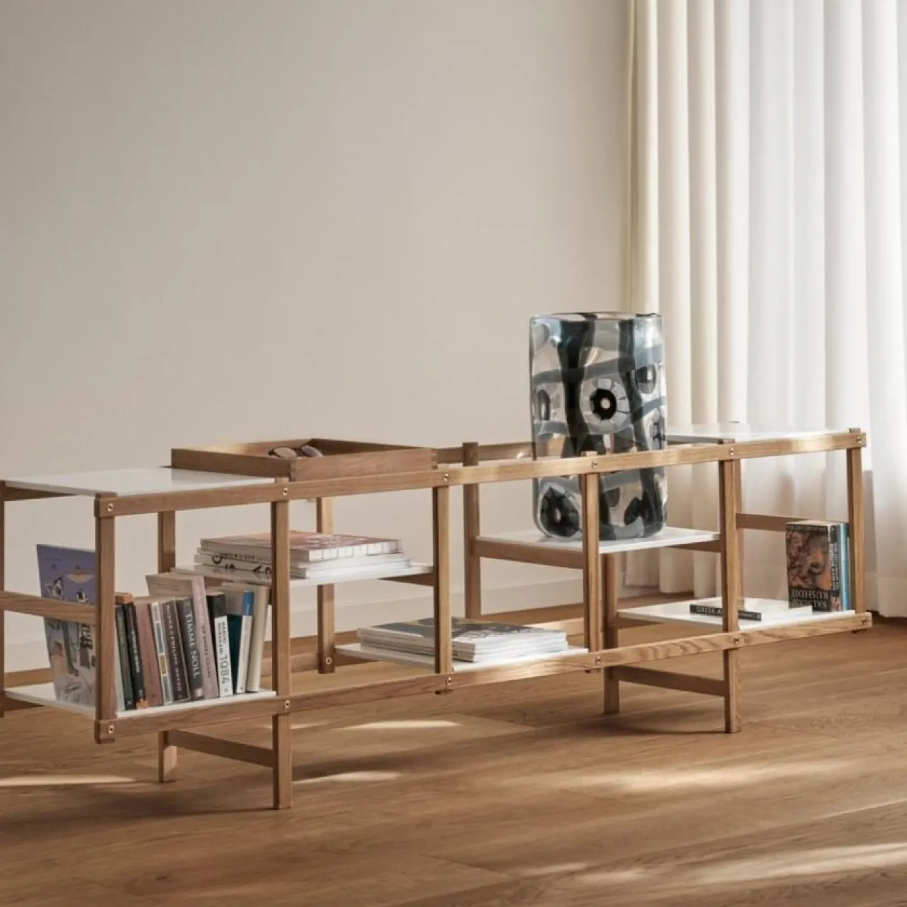Hylla Frame låg ek från Design House Stockholm. Frame kommer att passa bra mot en vägg, som rygg till en soffa, som rumsavdelare eller som fristående enheter. Frame är det perfekta möbelsystemet att visa upp snarare än att förvara, behovet av att uttrycka sin personlighet för att passa in i en kultur. En fysisk, långvarig och transformerbar plattform för människor att använda i sina hem. Arkitekturen förändras med moderna utrymmen där glasväggar från golv till tak och inbyggda garderober kräver öppna och transparenta hyllsystem som inte skuggar dagsljuset samtidigt som de skapar en plattform för dekoration.