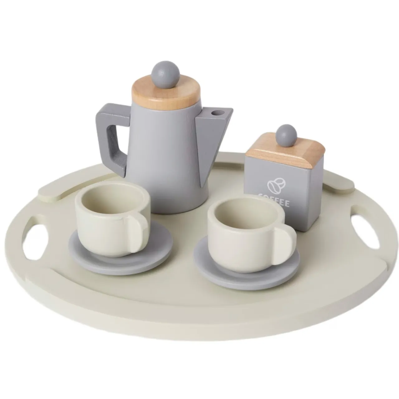 Kaffeset i trä för alla barn som vill bjuda familjen eller gosedjuren på fika. I setet ingår en kaffeburk med lock, en kaffekanna med lock, två koppar, två assietter och en bricka. 9 delar.