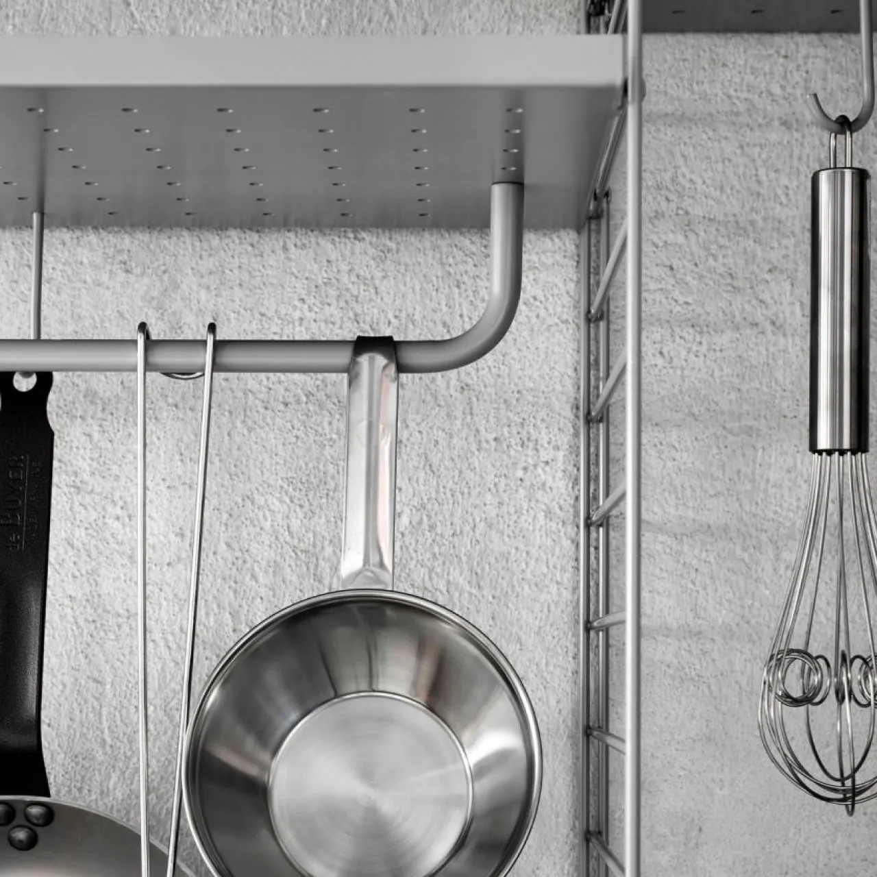 Robust Stringhyllplan i grå strukturlackad perforerad metall, perfekt till köket eller hallen. Formgiven av Anna von Schewen & Björn Dahlström för String Furniture.