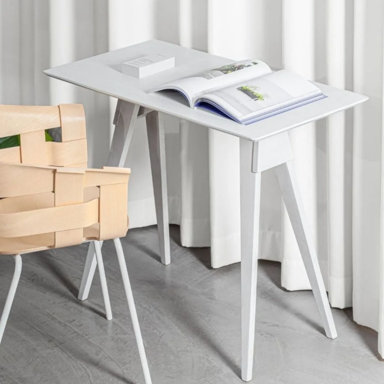 Arco Side Table från Design House Stockholm är en vidareutveckling av den isländsk-amerikanska formgivaren Chuck Macks populära skrivbord med samma namn. Konstruktionen är lika enkel som den är smart, två små benbockar med en rektangulär skiva ovanpå. Sidobordet passar perfekt för ”compact living” och fungerar utmärkt som ett litet skrivbord eller som ett dekorativt växtbord.