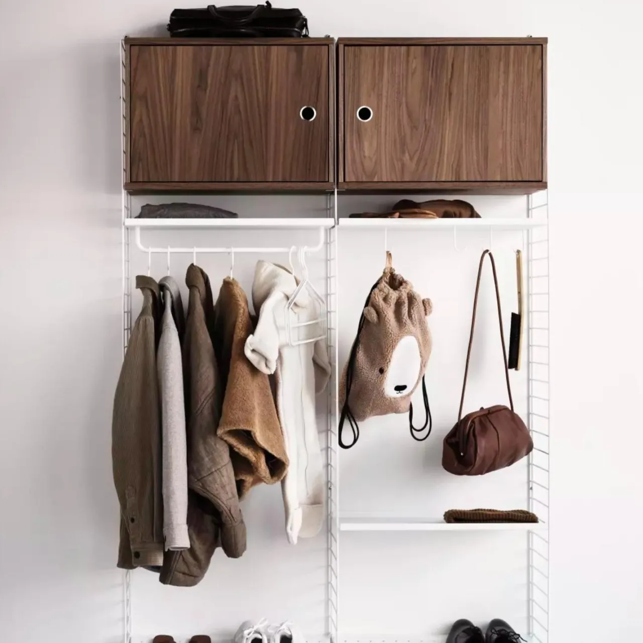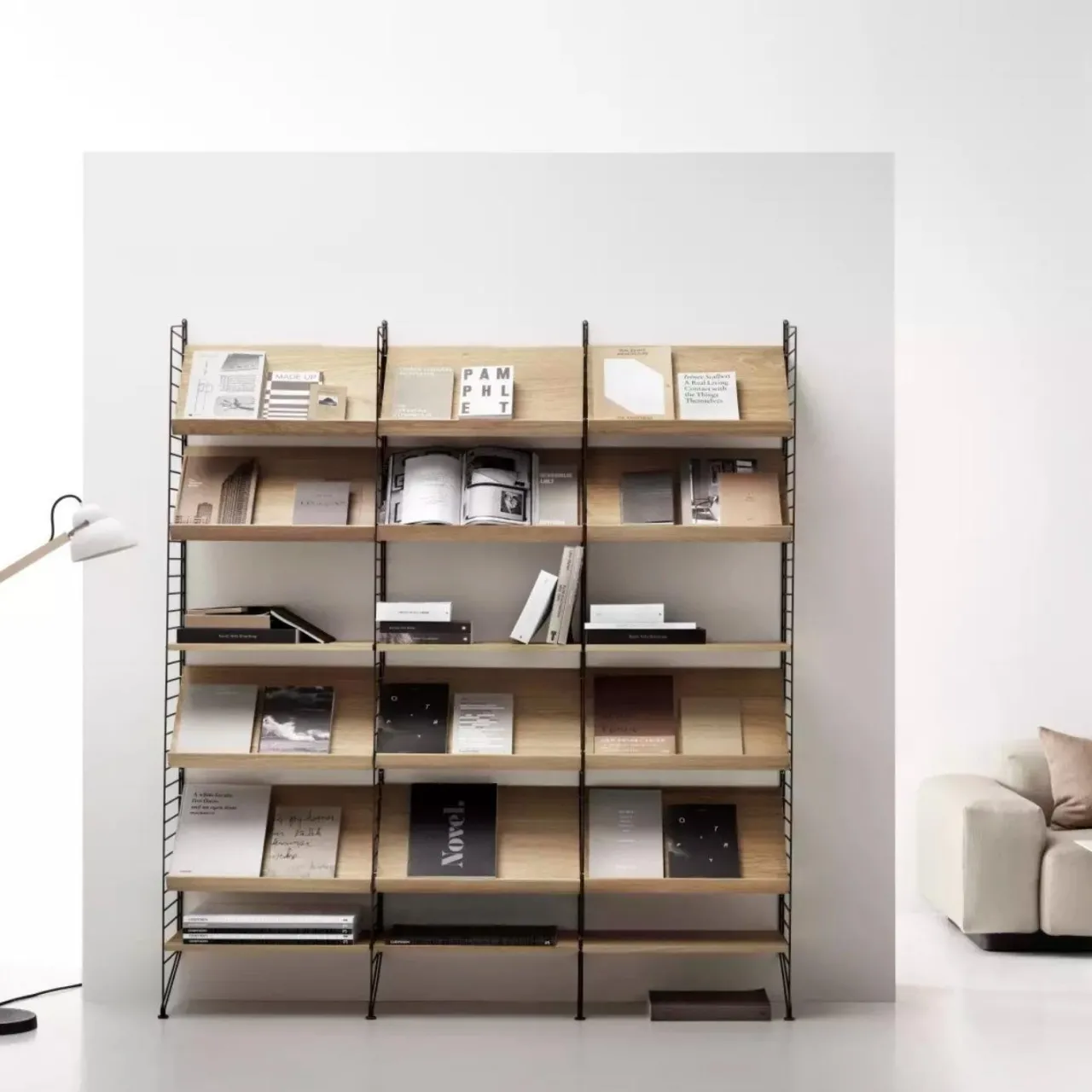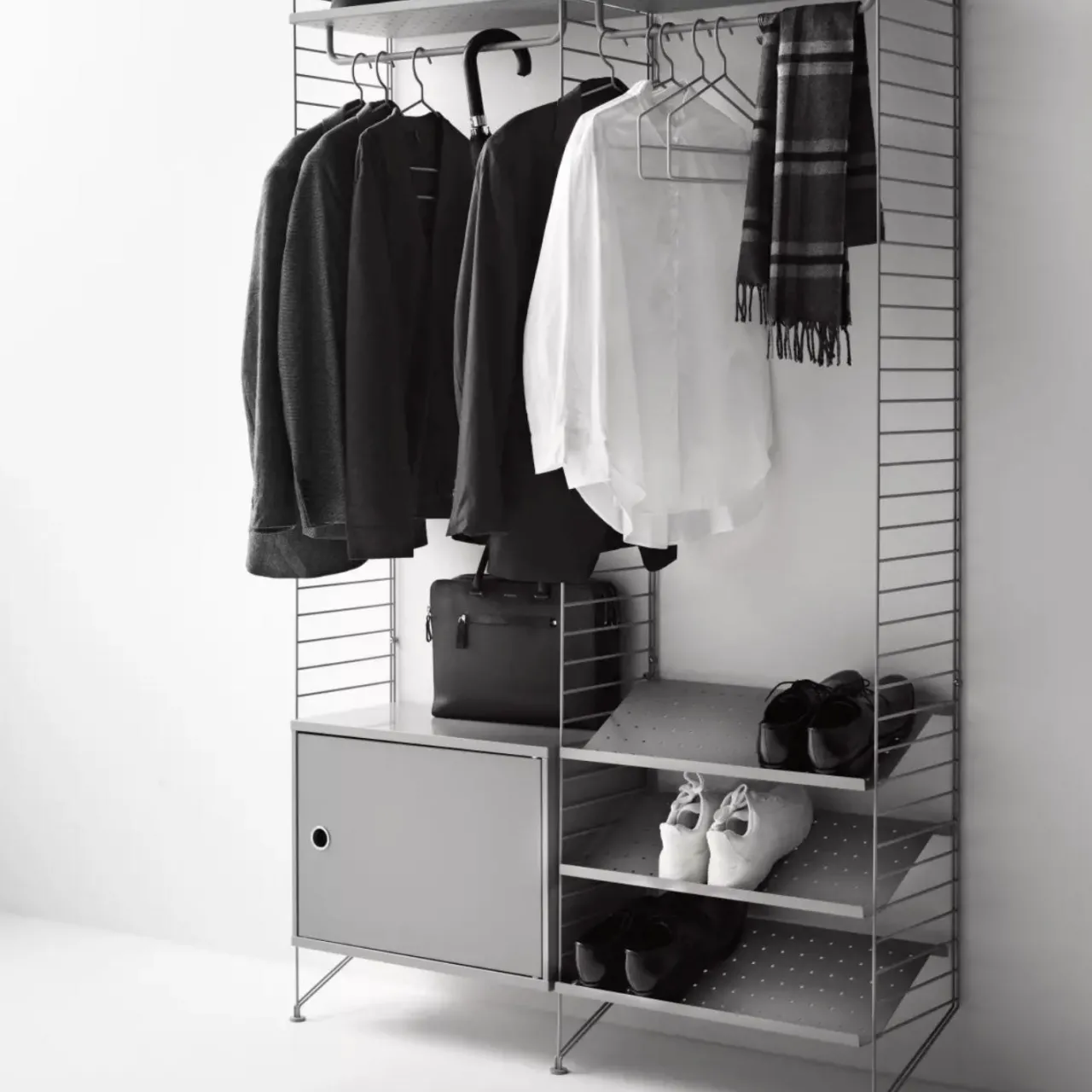Golvgavlar finns i tre höjder, 85 cm, 115 cm, 200 cm, samt ett djup, 30 cm. Gavlarna är basen för att bygga din stringhylla. Därefter kan du addera produkter från String System förutsatt att de har 30 cm djup. Välj mellan en rad olika produkter så som hyllplan, skåp, lådhurtsar och tidskriftshyllor. Golvgaveln vilar mot golvet med sin fot vilket gör den väldigt stabil men samtidigt ger en lätt och luftig känsla. För att göra din hylla ännu mer funktionell och unik kan du komplettera med organizers, knivblock eller en tidskriftssamlare som hängs på gaveln. Golvgavlarna säljs i både 1-pack och 2-pack.