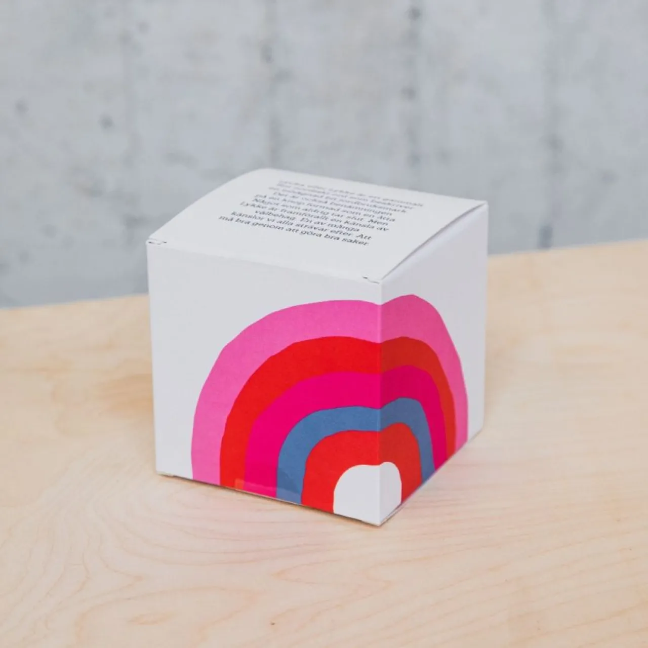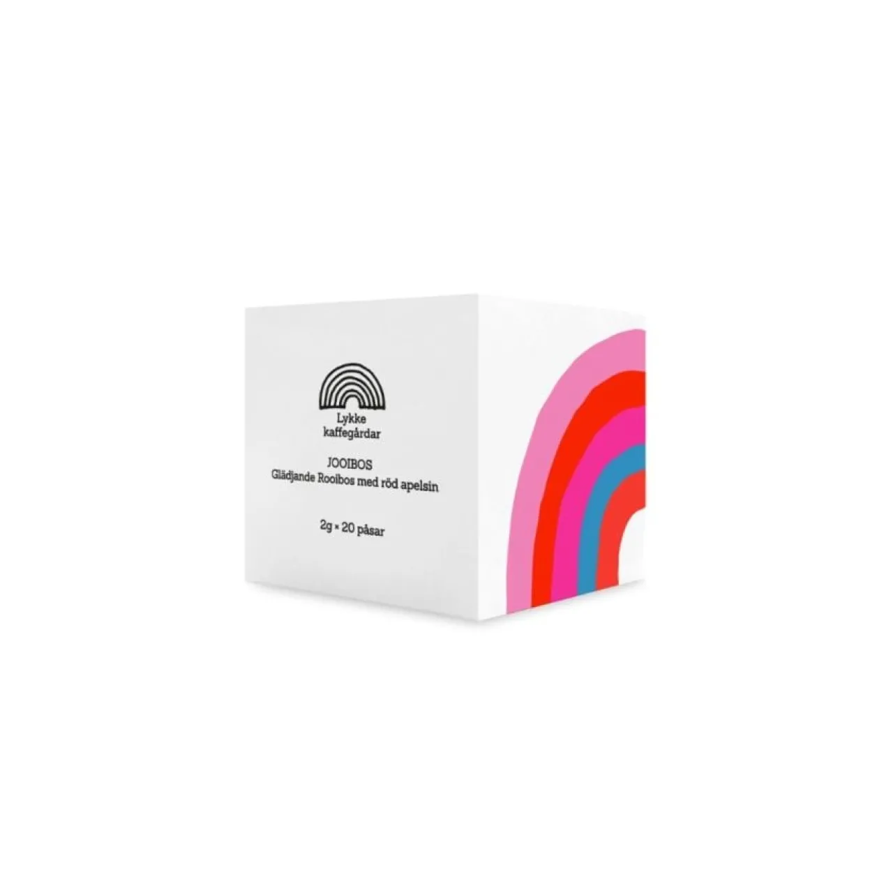 Te med smaken Jooibos (Rooibos med röd apelsin) från Lykke Kaffegårdar. Lykke Kaffegårdar jobbar med hållbart kaffe och te i prisbelönta förpackningar. Teerna är alltid ekologiskt odlade och smaksätts varsamt med ekologiskt certiferade och naturliga smakämnen. Jooibos kommer i en förpackningn med designen av en regnbåge.