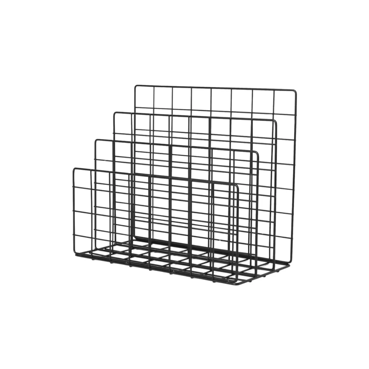 Stående förvaringsställ med tre fack som håller ordning på magasin, anteckningsböcker eller teckningar.