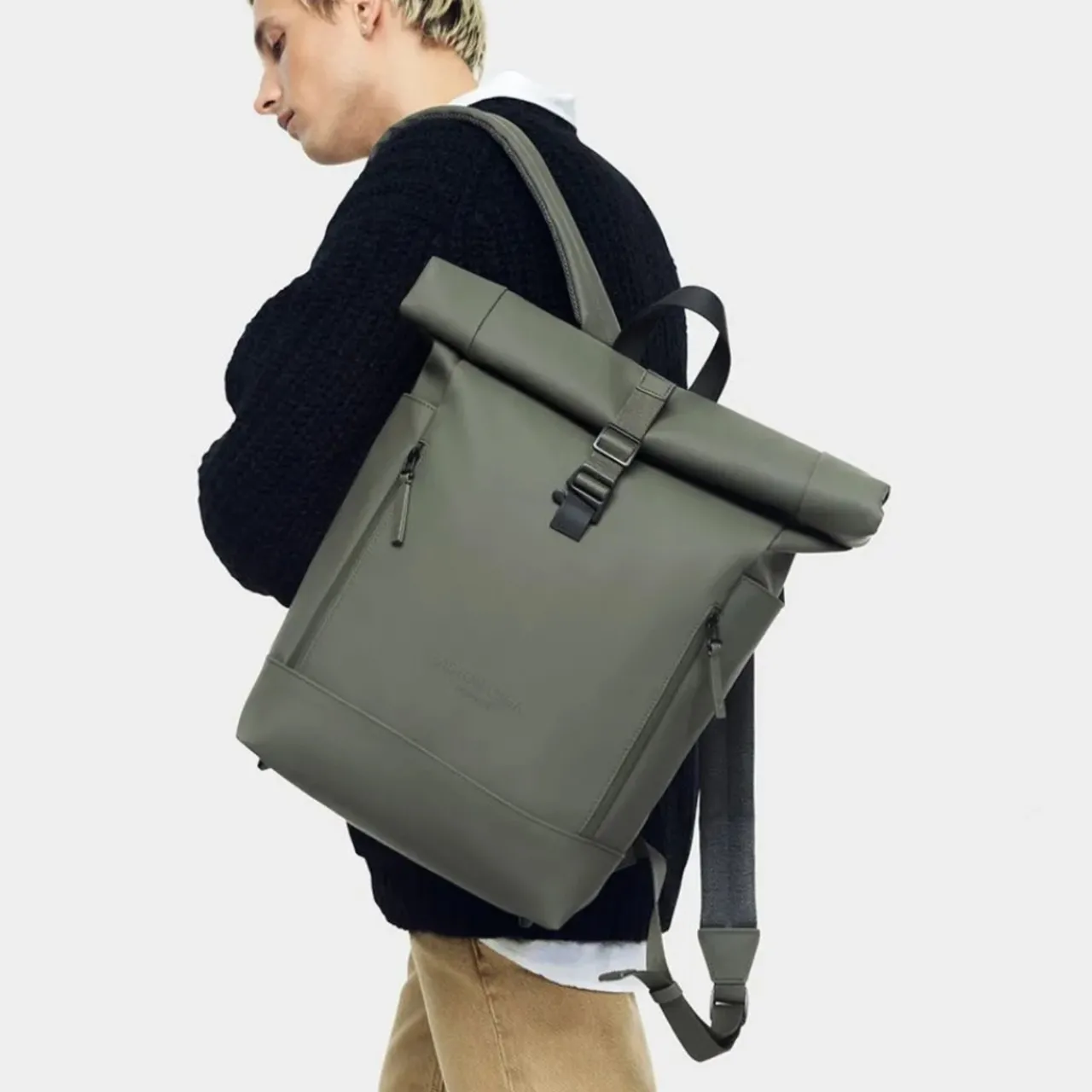 Rullen-ryggsäcken återvänder i ett mer planetvänligt material, mindre storlek och med två nya moderna färgblockerade mönster. Tillverkad av vattentät PU, den har vår signatur roll-top, så att du kan justera lagringsutrymme. Det stora huvudfacket rymmer lätt alla dina tillhörigheter, inklusive bärbara datorer upp till 13″”, och har gott om fickor för mindre väsentligheter. Från Gaston Luga.
