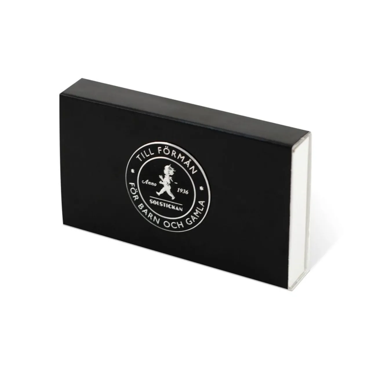 Designad tändsticksask med stilfullt emblem på framsidan och mönster på baksidan med avbildning av den klassiska Solstickanpojken skapad av Einar Nerman 1936. Tillverkad i Tidaholm, Sverige. Se matchande brandsläckare och brandfiltar nedan.