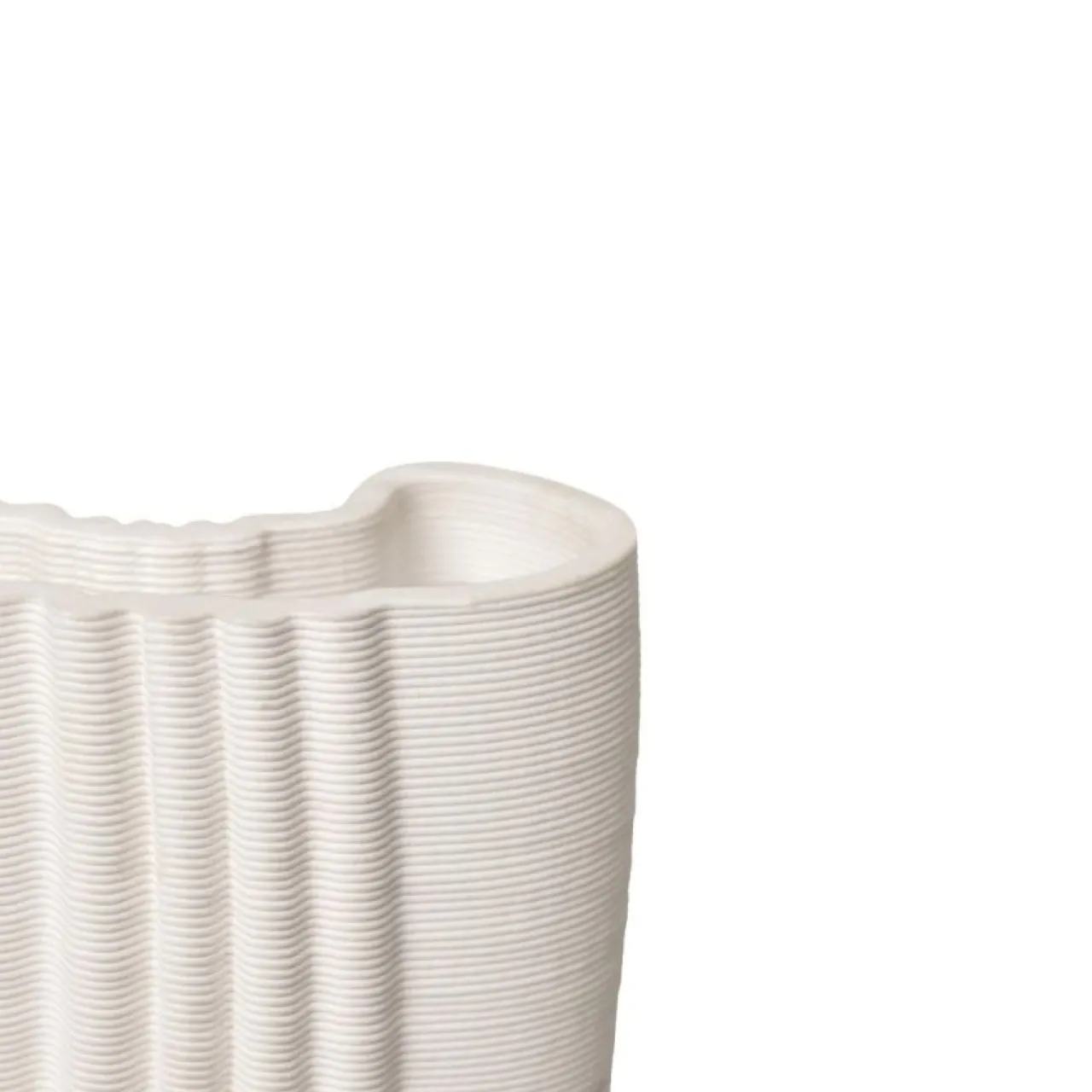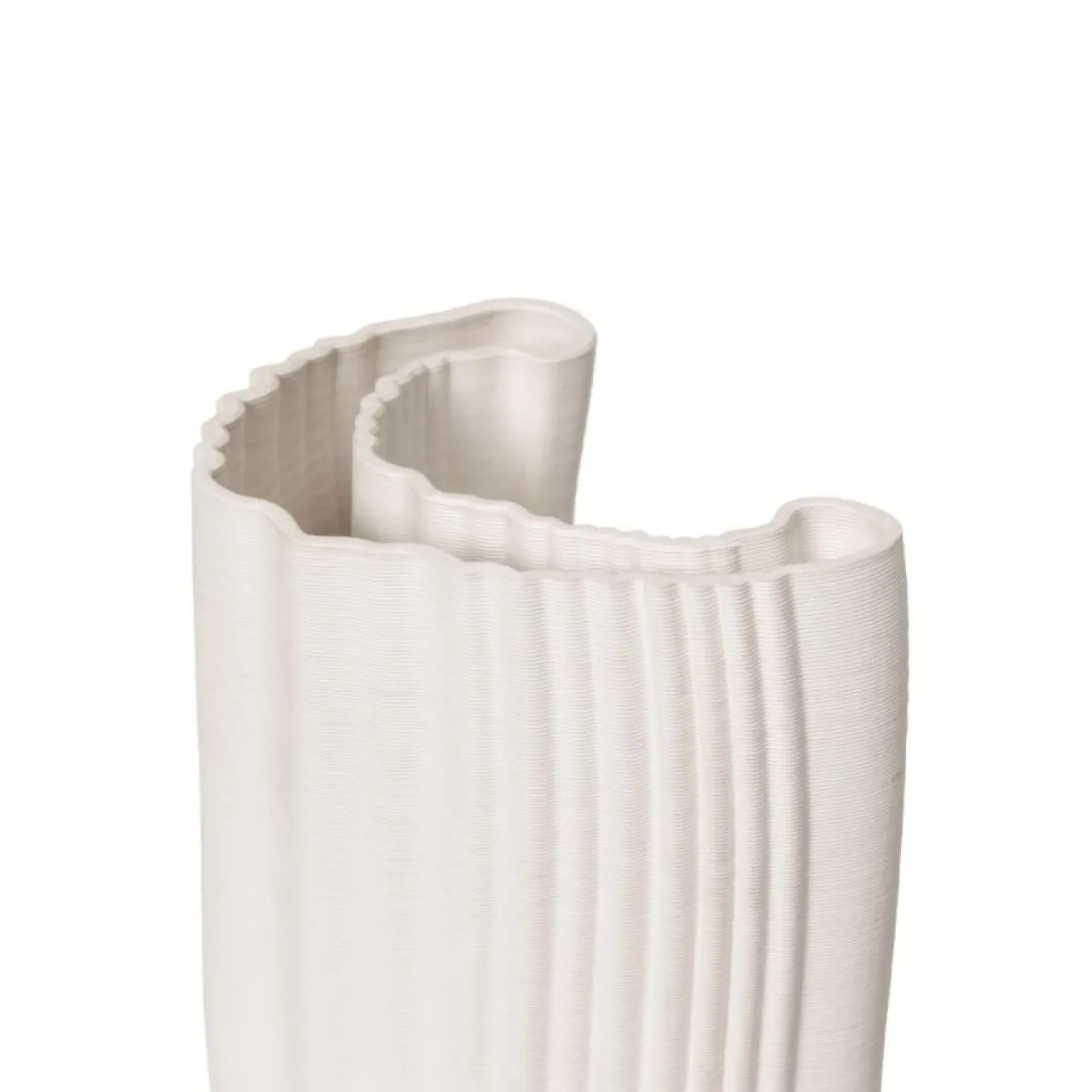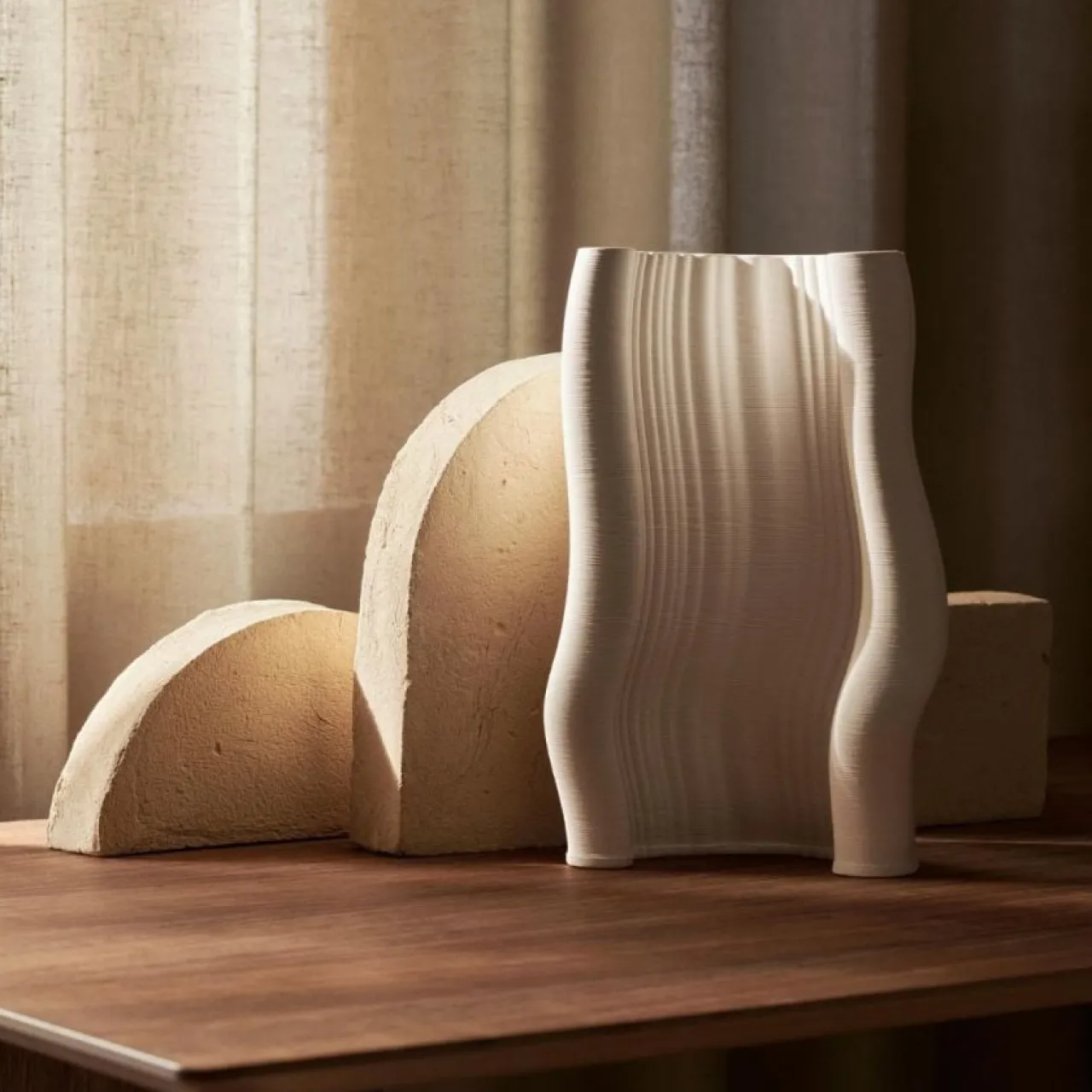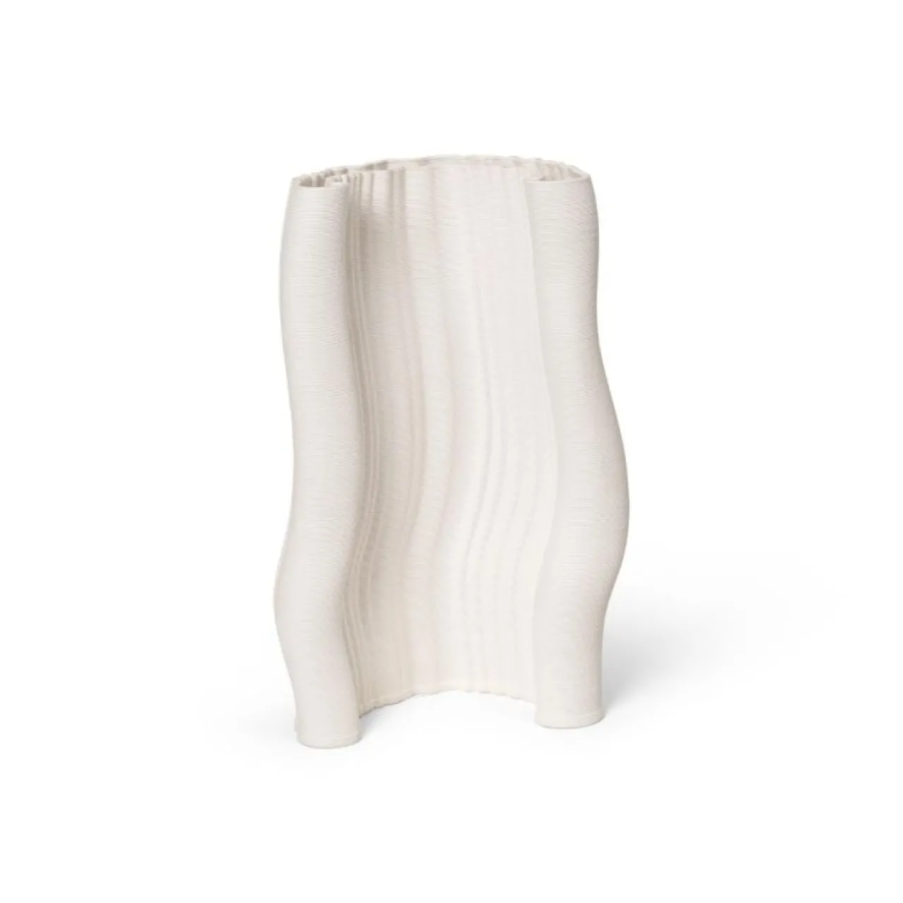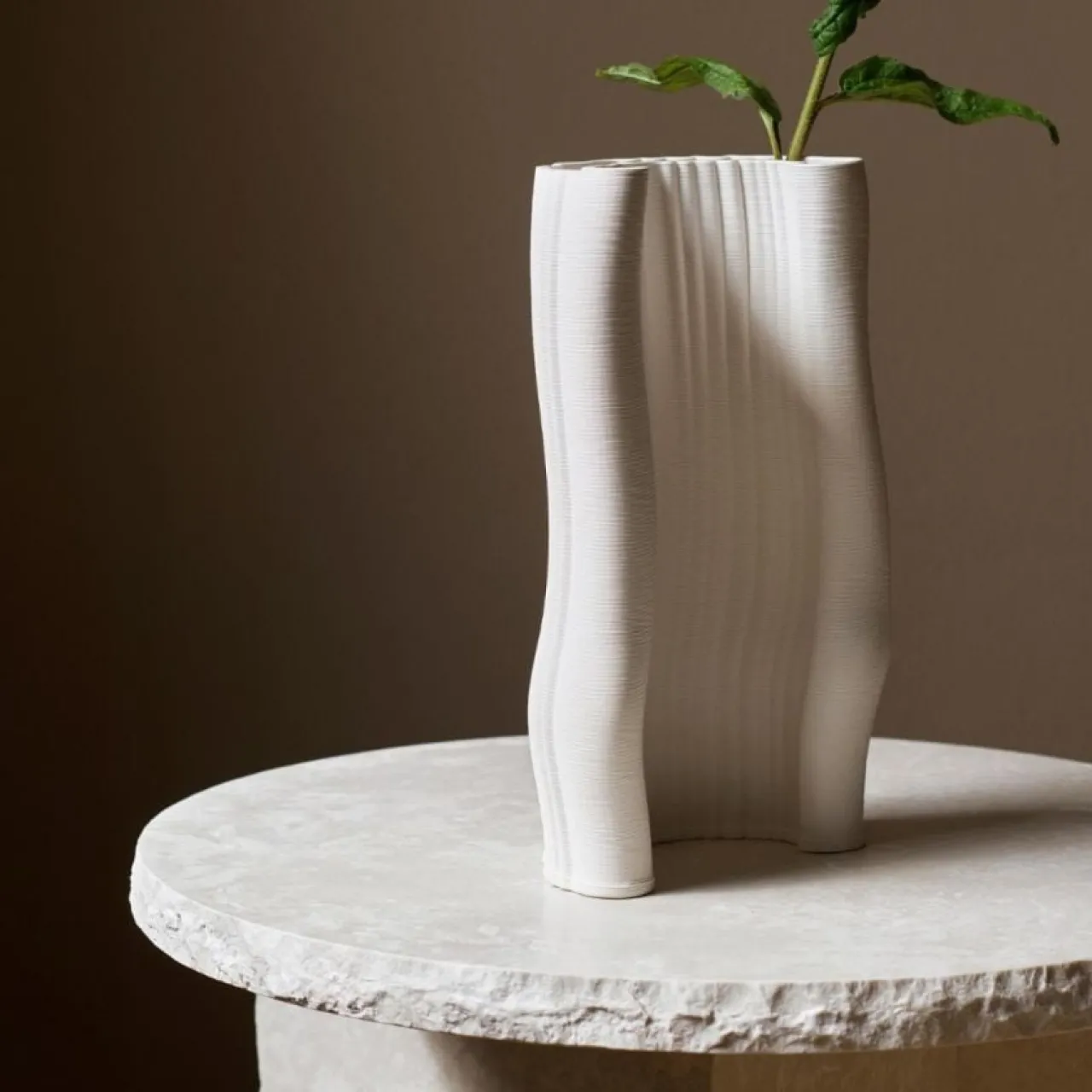 Vasen Moire är en vacker vas från Ferm Living som du antingen kan placera dina favoritblommor eller grenar i, eller låta göra ett uttalande helt på egen hand med sitt fina utseende. Namnet kommer från det franska ordet för ”vattnad” och moirémönstret representerar en grafisk effekt som uppstår när det organiska och geometriska krockar. Moire-vasen har skapats genom en process av 3D-utskrift av lera, vilket resulterar i tunna lager som gradvis har format ett subtilt mönster tvärs över vasens kropp och avslöjar dess digitala ursprung.