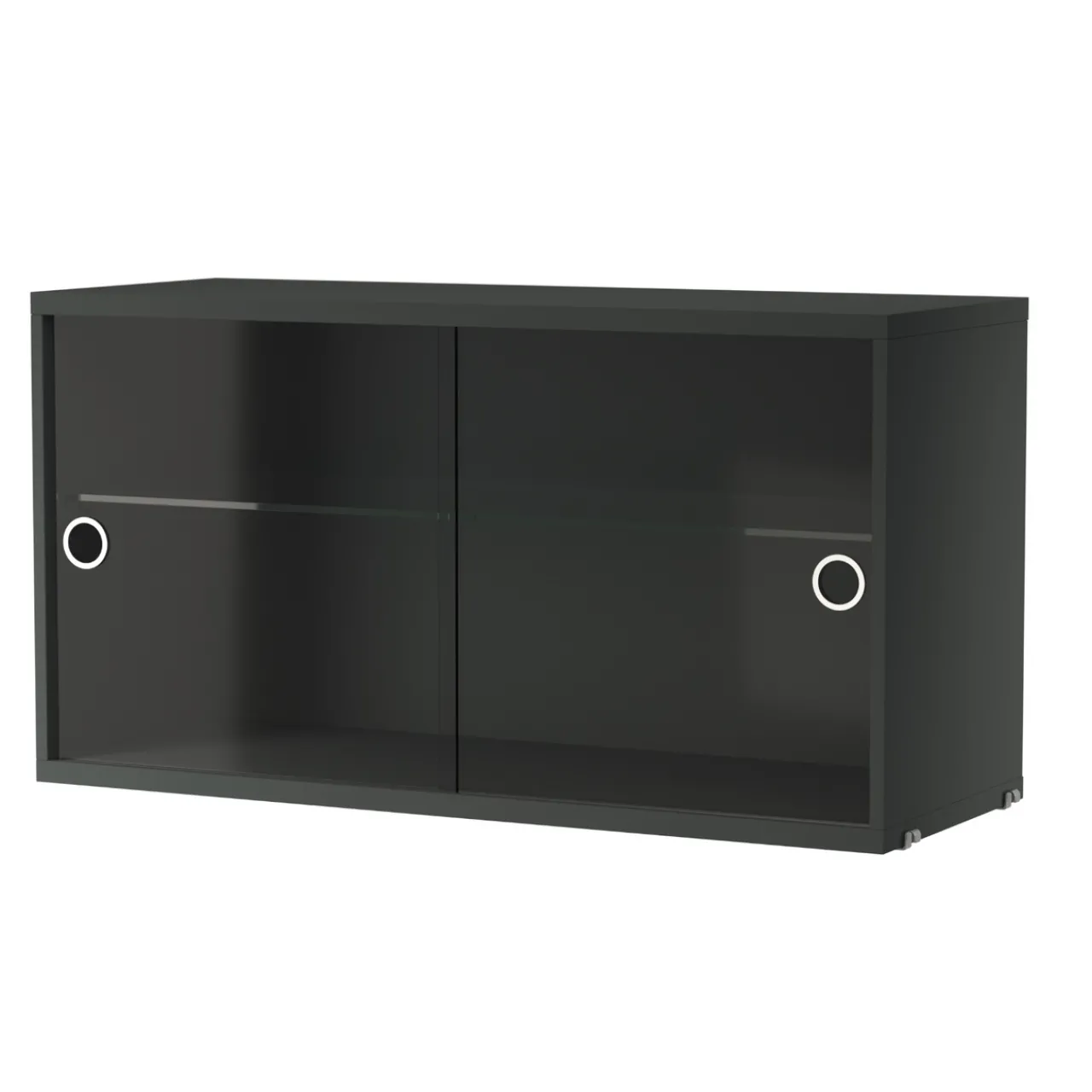 Vitrinskåpet med skjutdörrar kan enkelt integreras i String®-hyllsystemet i några få steg. Vitrinskåpet finns i en bredd, 78 cm, och ett djup, 30 cm och inkluderar ett innerhyllplan i glas.