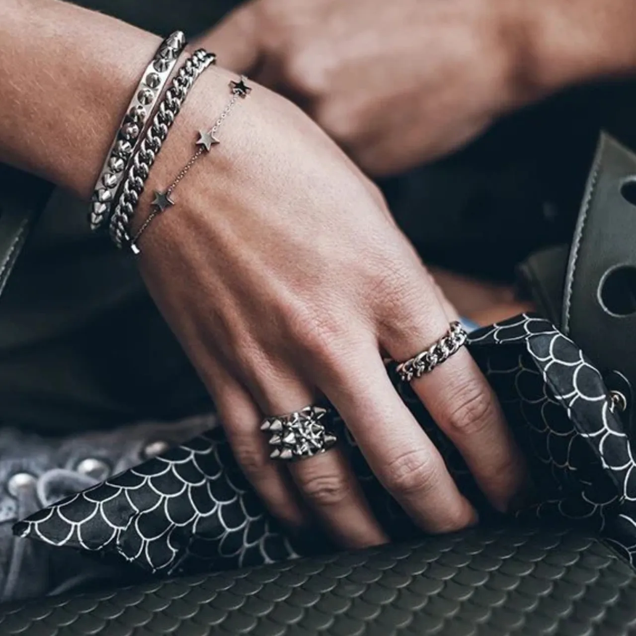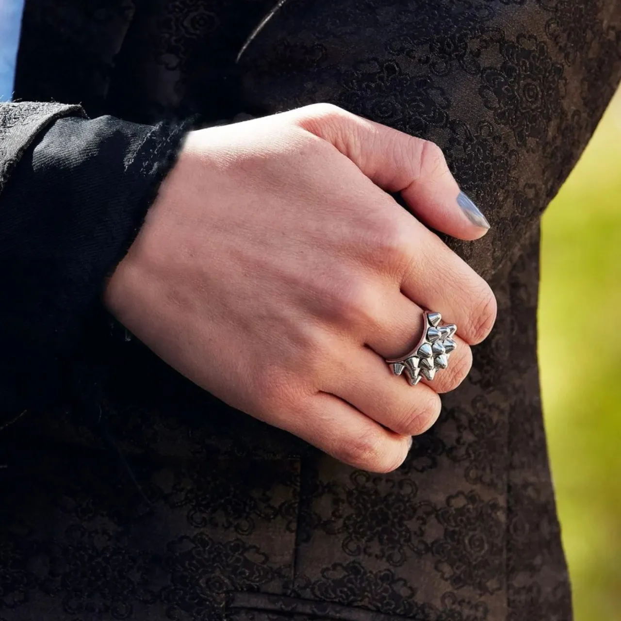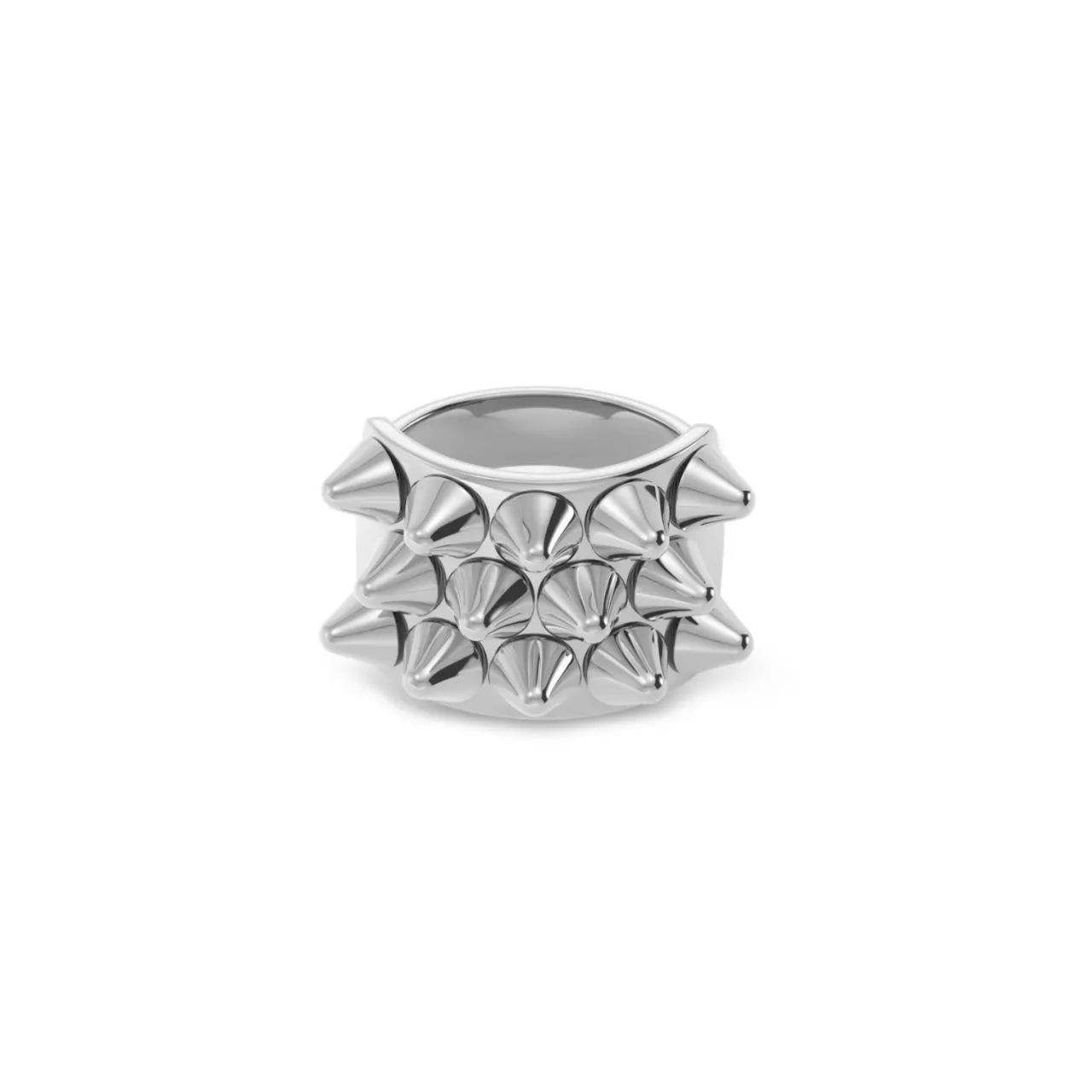 Peak, som är en efterfrågad favorit, är en verklig statementring med en modern tolkning av punkiga nitar. Peak kommer nu i två nya storlekar, XS och XL, ses här i blankt rostfritt stål. Höjd 4 mm, bredd 15 mm, skenans storlek 5×1 mm Blankt rostfritt stål, Nickelsäkert. Då detta är en bredare ring så rekommenderar vi att du går upp en storlek.