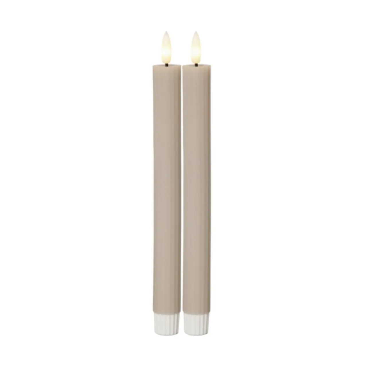 2-pack antikljus i beige från Startradings Flamme Stripe serie, gjorda i vax i med en räfflad-randig yta. Ljusen har en mycket naturtrogen låga som lyser med varmvitt sken. De har timerfunktion vilket gör att ljusen lyser i 6h per dag i ca 30 dagar. De drivs av 2 AAA batteri för varje ljus, dessa ingår ej.
