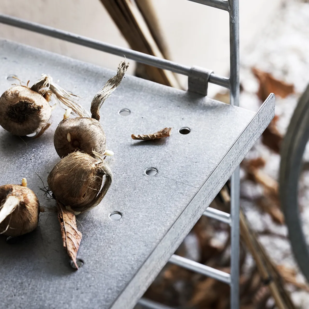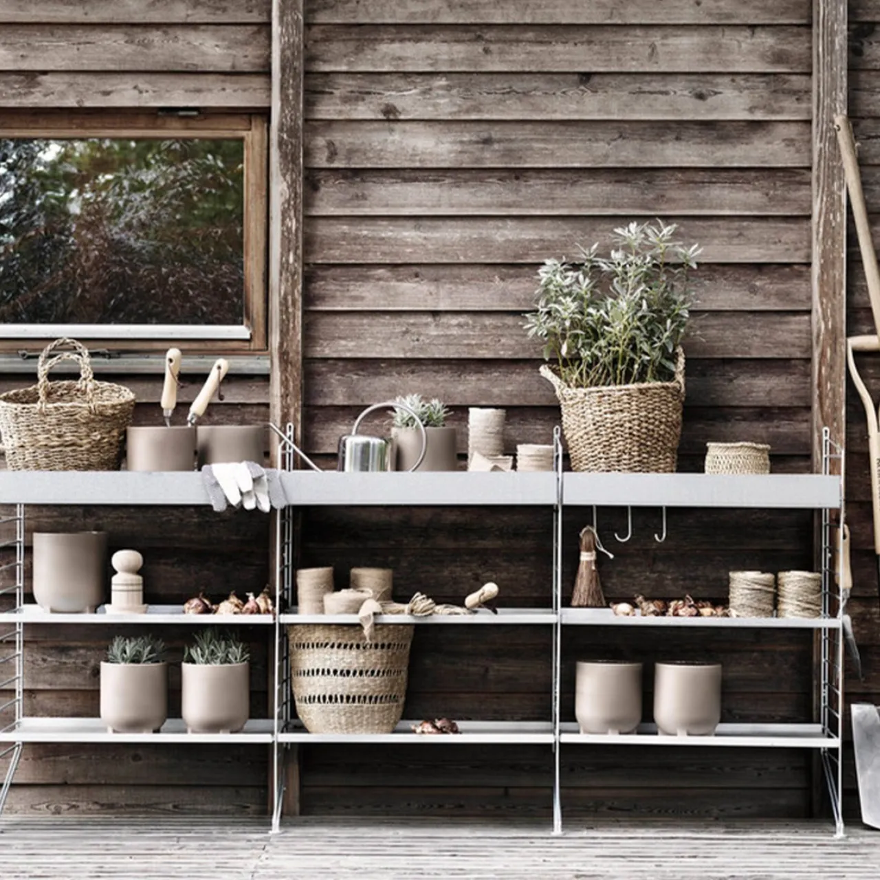 Robust Stringhyllplan i strukturlackad perforerad metall, perfekt till köket eller hallen. Formgiven av Anna von Schewen & Björn Dahlström för String Furniture.