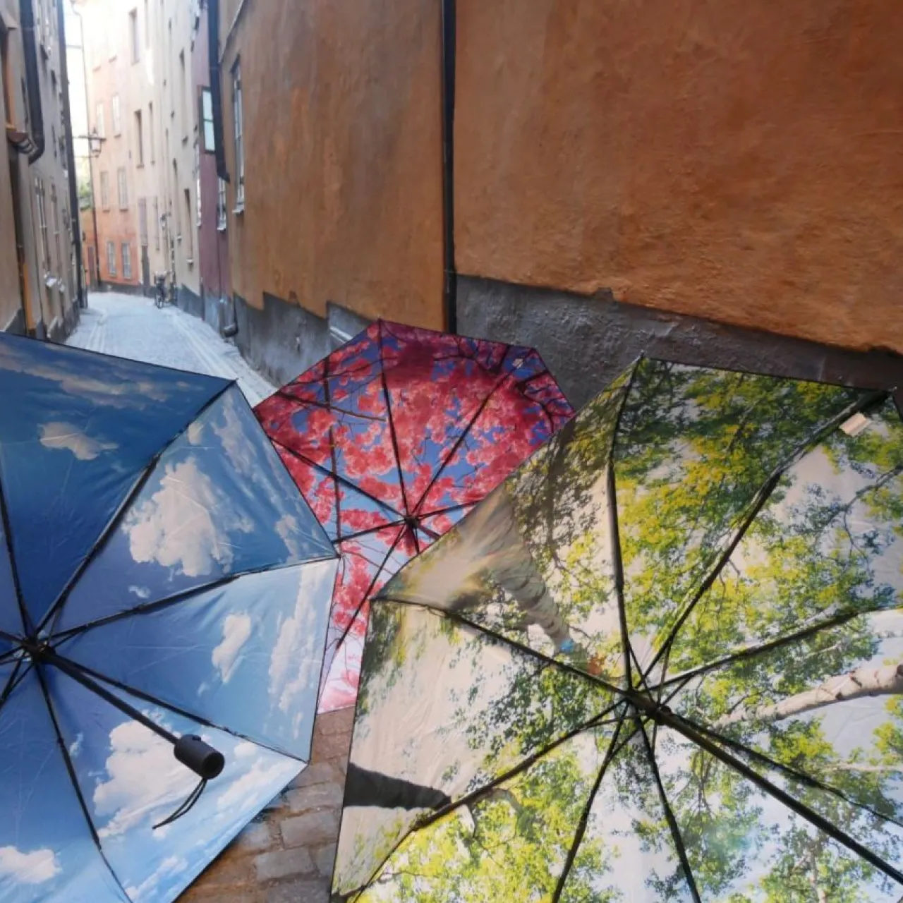 Kompaktparaply från stockholmsbaserade HappySweeds. Paraplyet har ett greppvänligt gummihandtag och supersmart automatisk upp- och ihopfällning med ett enkelt knapptryck. Gjord i vindtätt material med svart ovansida och olika mönster på undersidan. Praktiskt fodral medföljer och paraplyet levereras i en svart tub.