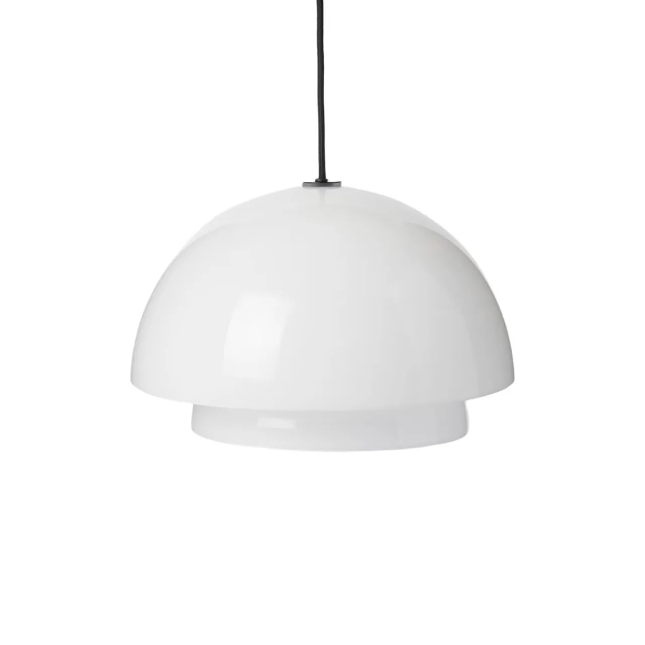 Lampan har en skärm av glas och en svart textilsladd med färgmatchad takkopp.