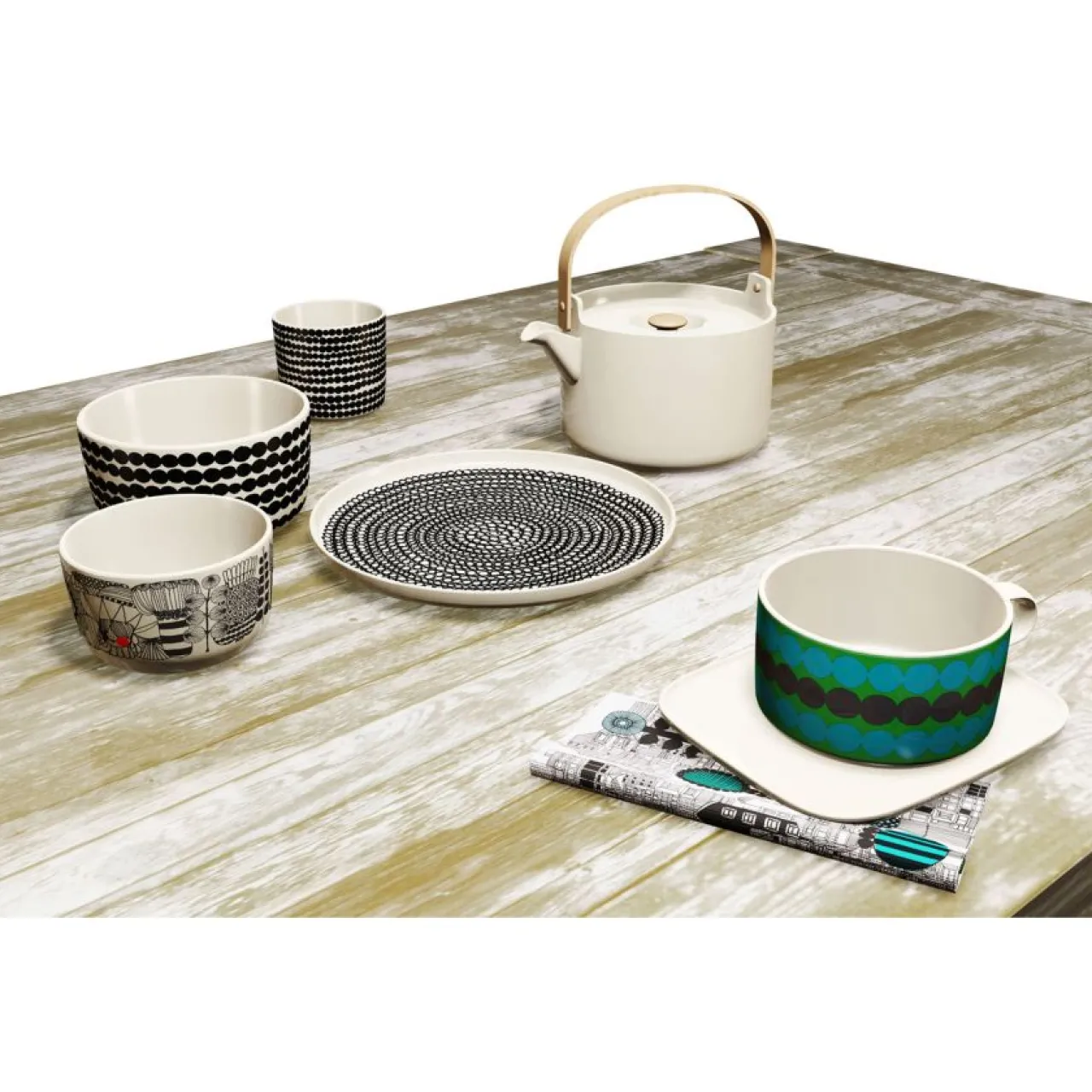 Den flata tallriken Räsymatto ingår i Marimekkos populära serie Siirtolapuutarha. Tallriken är tillverkad i högkvalitativt stengods med ett lekfullt mönster i svart och vitt. Modellen på tallriken är formgiven av Sami Ruotsalainen och mönstret är skapat av Maija Louekari. Räsymatto är det finska ordet för trasmatta, och det är tydligt att Louekari hittat inspirationen till mönstret från just sådana.