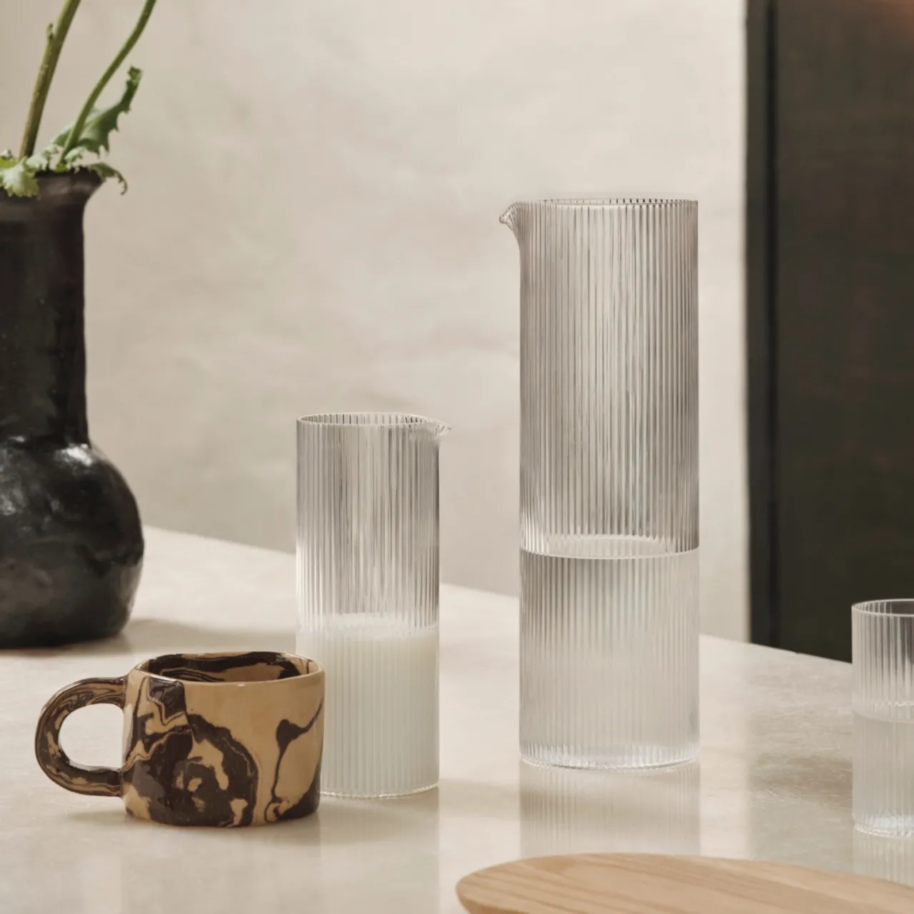 Munblåsta Ripple Vattenkaraff från Ferm Living är tillverkad med minutiös precision och förkroppsligar den tidlösa elegansen i den populära Ripple familjen. Precisionspipen är utformad för oöverträffad funktionalitet och mångsidighet och gör det enkelt att hälla på ett kontrollerat sätt. Med sin stora kapacitet är denna kanna perfekt för alla typer av drycker, vilket gör att den lämpar sig för sammankomster, måltider och speciella tillfällen.