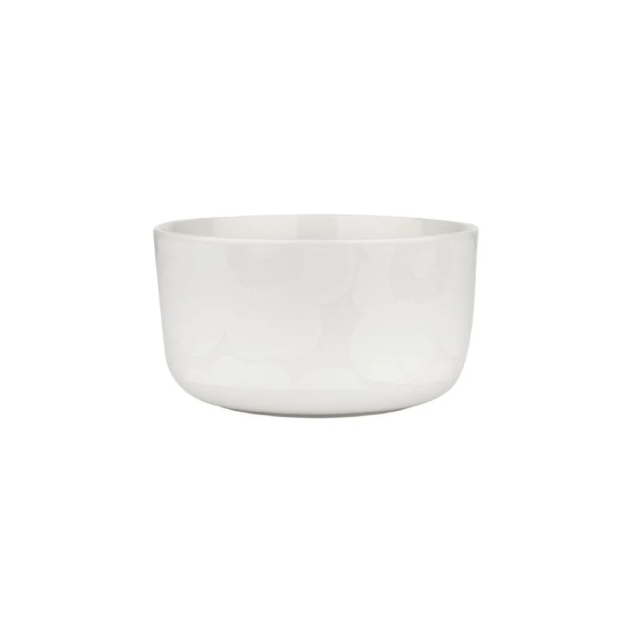 Skålen Oiva/Unikko har ett subtilt mönster av vallmo (Unikko) som symboliserar kreativitet. Mönstret föddes i en tid då knappt några blommönster ingick i Marimekkos kollektioner. Maija Isola var dock fascinerad av temat blommor och bestämde sig för att skapa en hel rad nya blommönster. Skålen är gjord av vitt stengods och tål diskmaskin, ugn, mikrovågsugn och frys. Ta bort klistermärket från produktens botten innan användning, det innehåller en liten mängd metall.