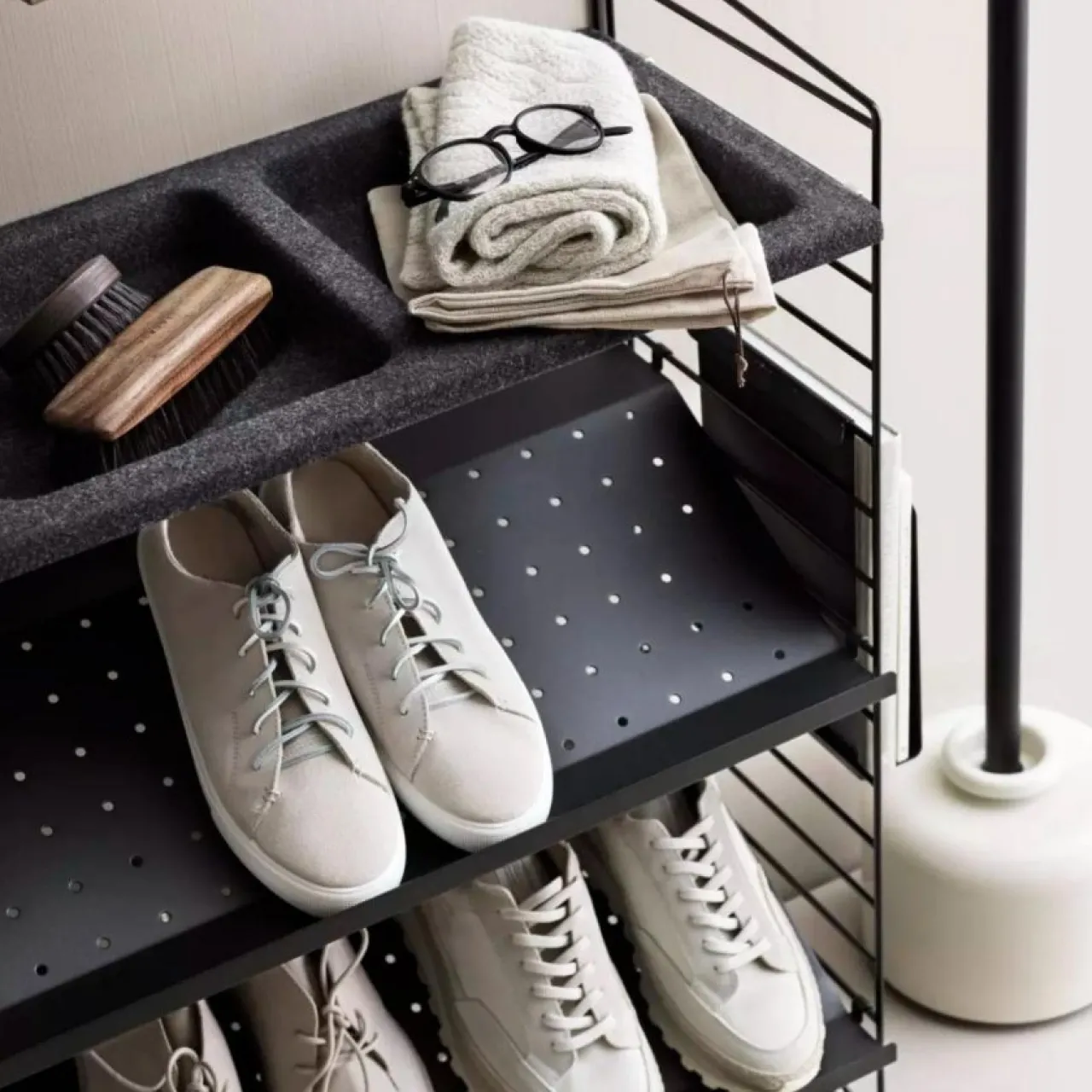 String skohylla i strukturlackad perforerad metall, perfekt till hallen. Formgiven av Anna von Schewen & Björn Dahlström för String Furniture.
