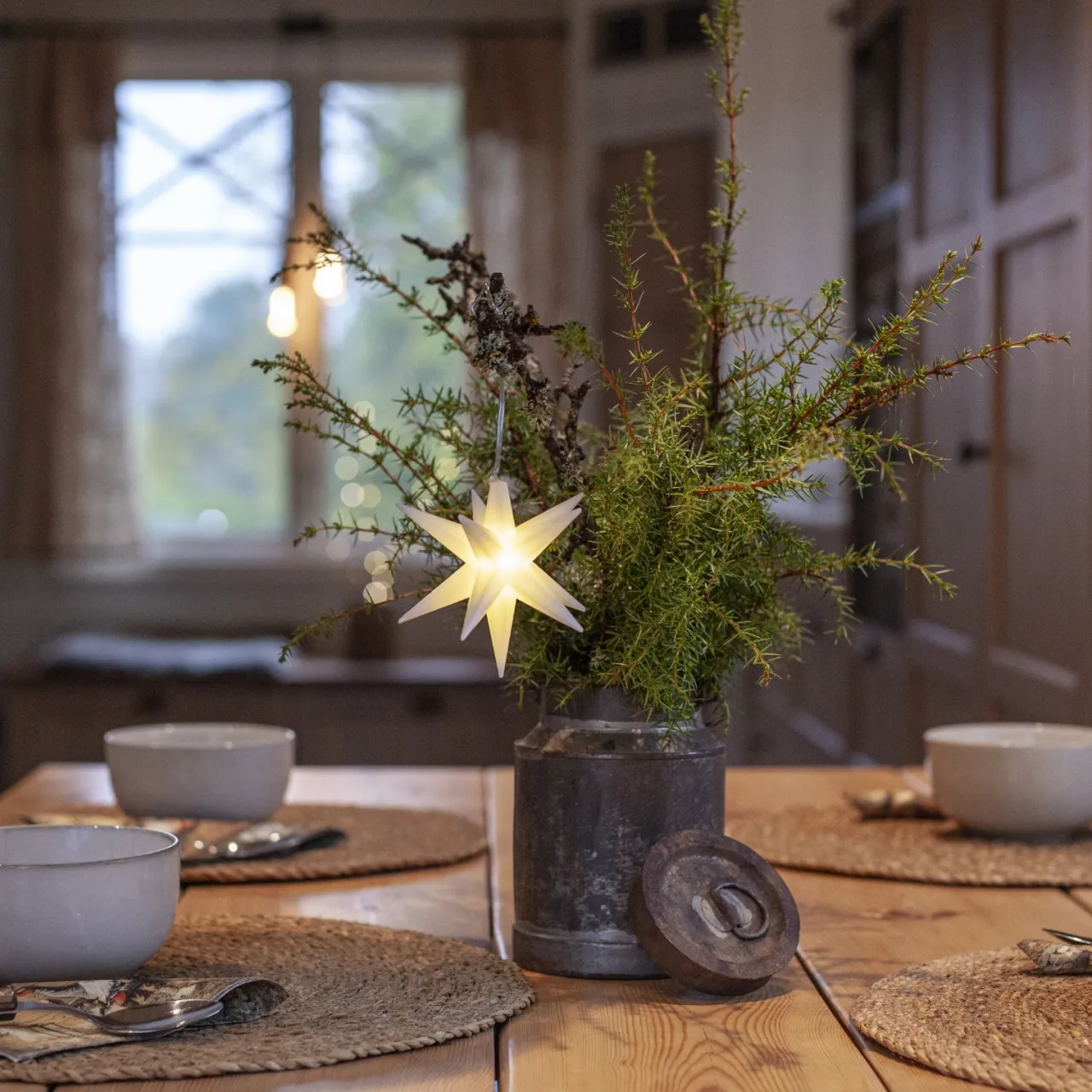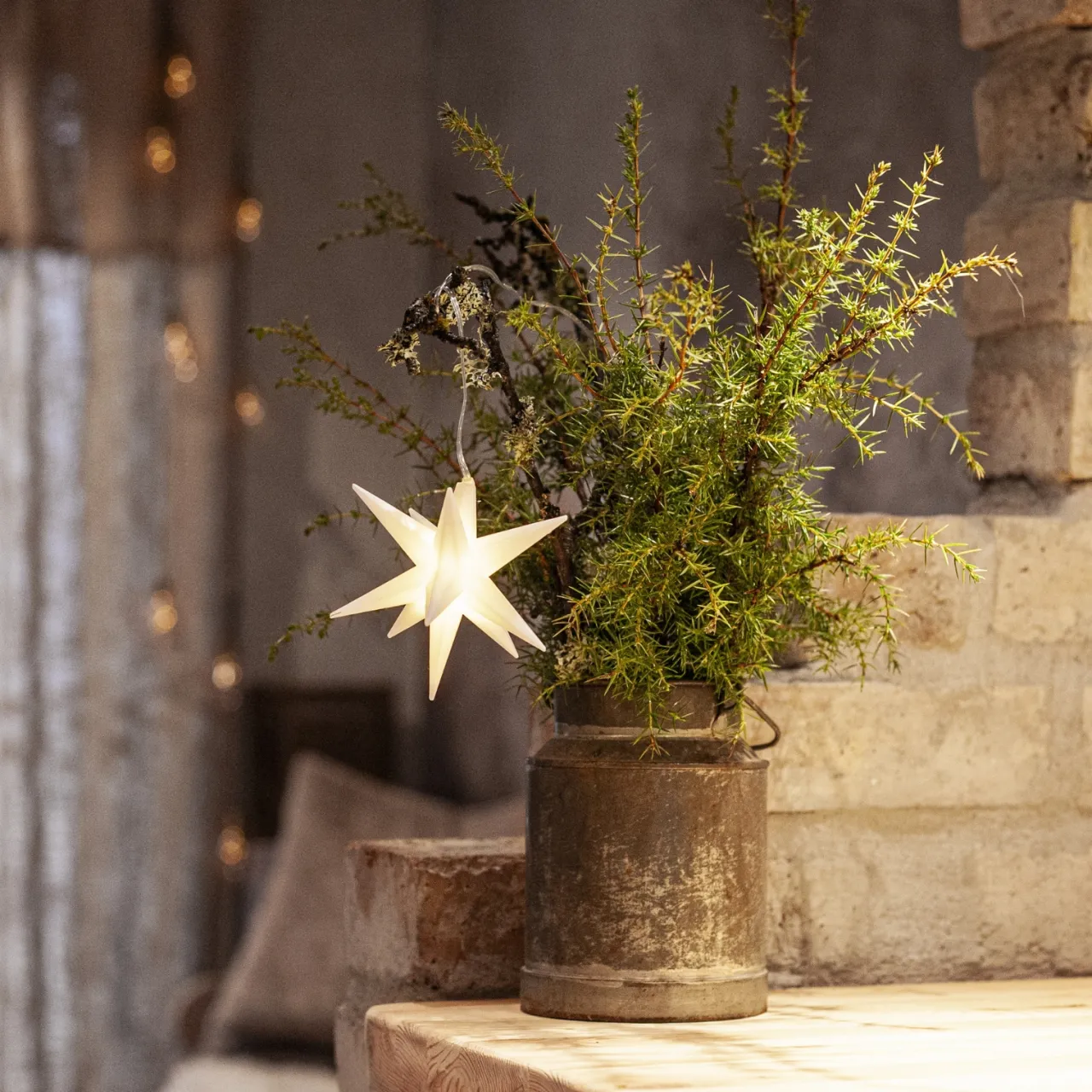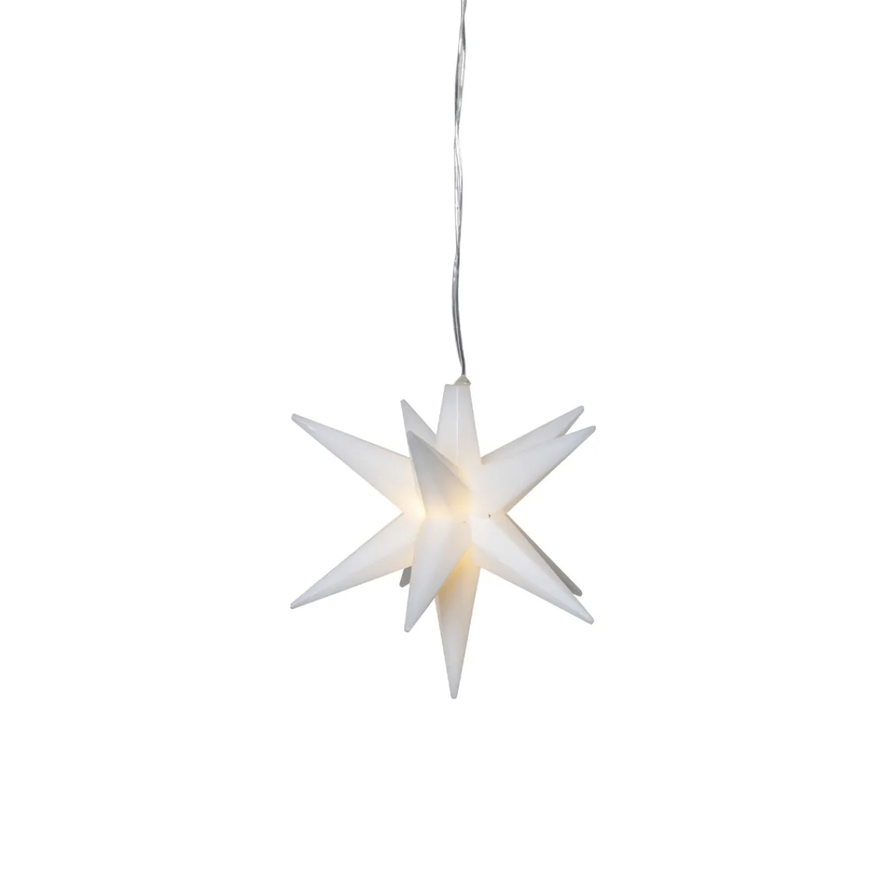 Skapa magisk vinterstämning med en tredimensionell batteridriven stjärna. Den är anpassad för utomhusbruk, men fungerar givetvis lika bra inomhus där du vill sprida extra julstämning. Stjärnan lyser med ett mjukt, varmvitt sken och levereras komplett med LED-lampa (batterier ingår ej). Tack vare den inbyggda timerfunktionen är det enkelt att ställa in när den ska lysa, så att den tänds och släcks automatiskt varje dag.